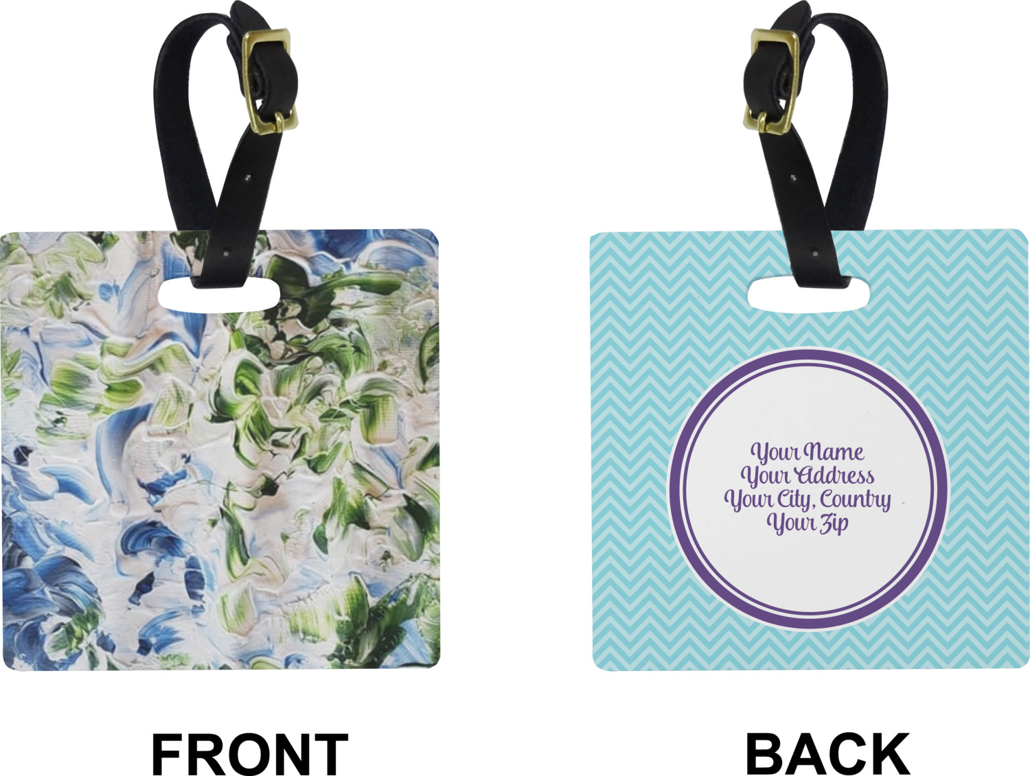 These personalized bag tags are sold in a variety of shapes, so that you may find the product that meets your vision exactly. We sell a round luggage tag, which measures at approximately 4" x 4". Our square luggage tag is about 3.5" x 3.5", while our rectangular version is 2.75" x 4 ".