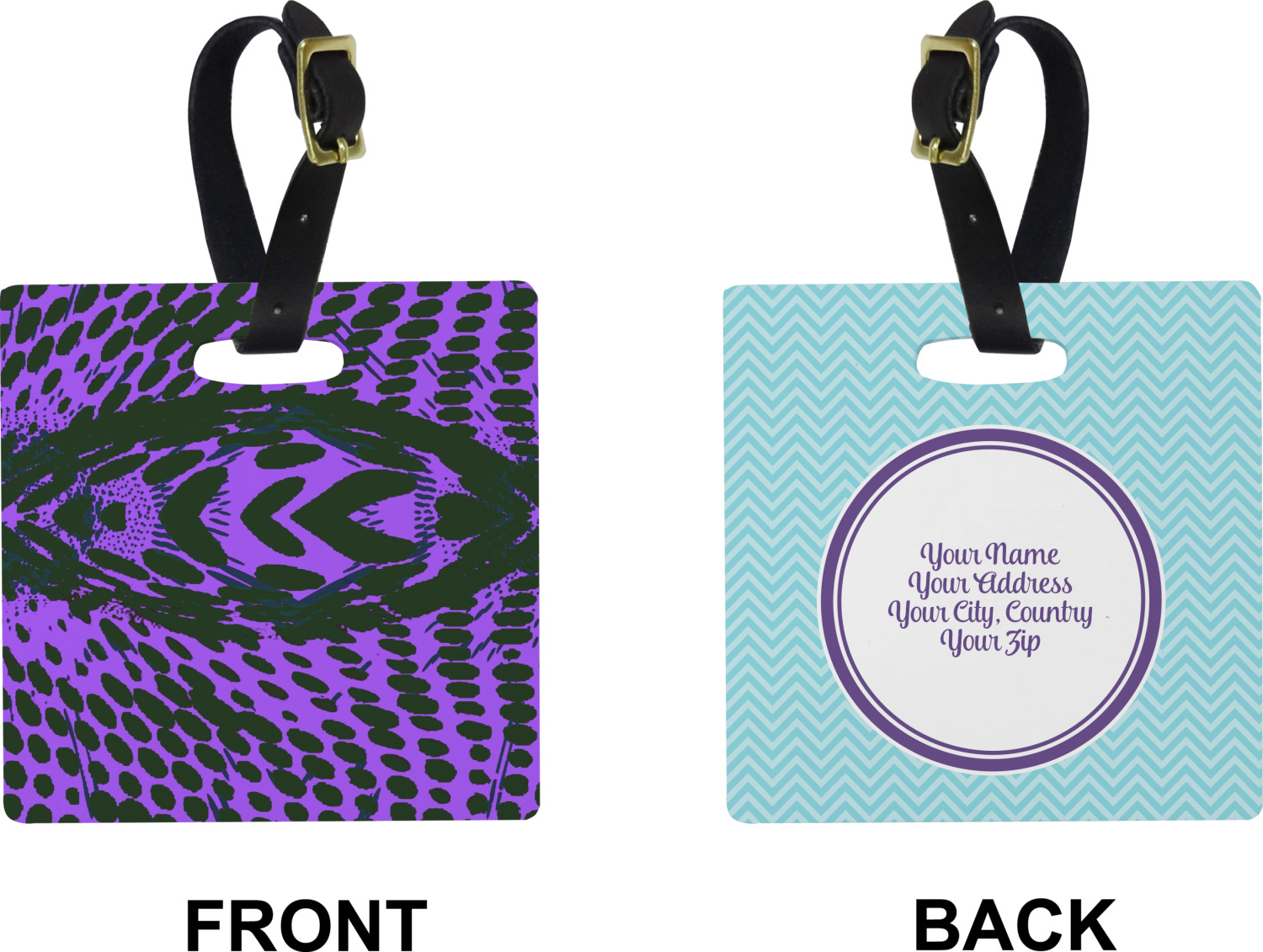 These cute luggage tags are made of a fiber-reinforced, UV-resistant plastic, making them waterproof and durable enough for both everyday use and the rugged adventures of any traveler! A leather strap with holes and a buckle is included with your purchase and can be used to attach your custom luggage tag to any suitcase, backpack, or duffel bag. You can design these travel tags as you wish; your customization will be displayed across the front, while the back will show as little or as much personal information as you want.