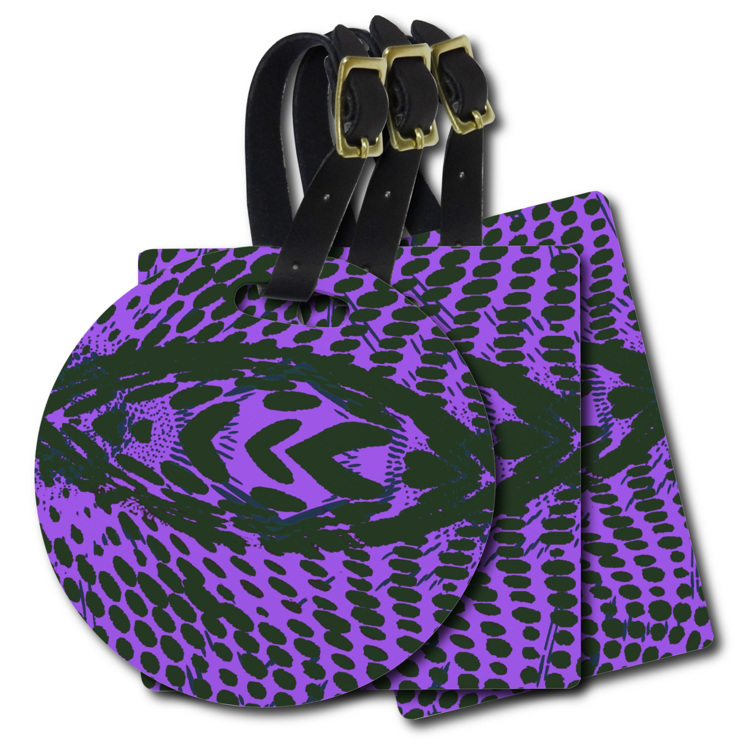 These personalized bag tags are sold in a variety of shapes, so that you may find the product that meets your vision exactly. We sell a round luggage tag, which measures at approximately 4" x 4". Our square luggage tag is about 3.5" x 3.5", while our rectangular version is 2.75" x 4 ".