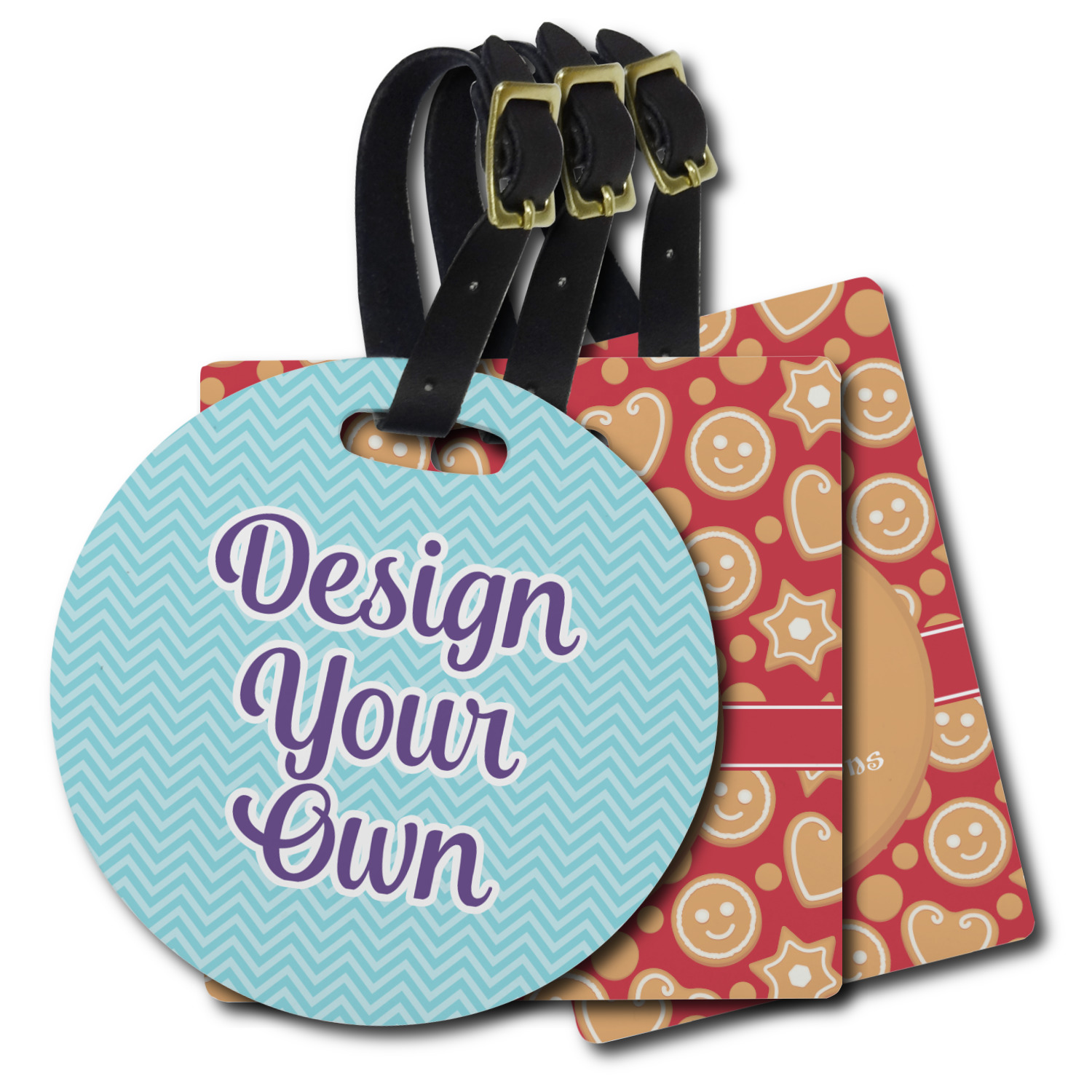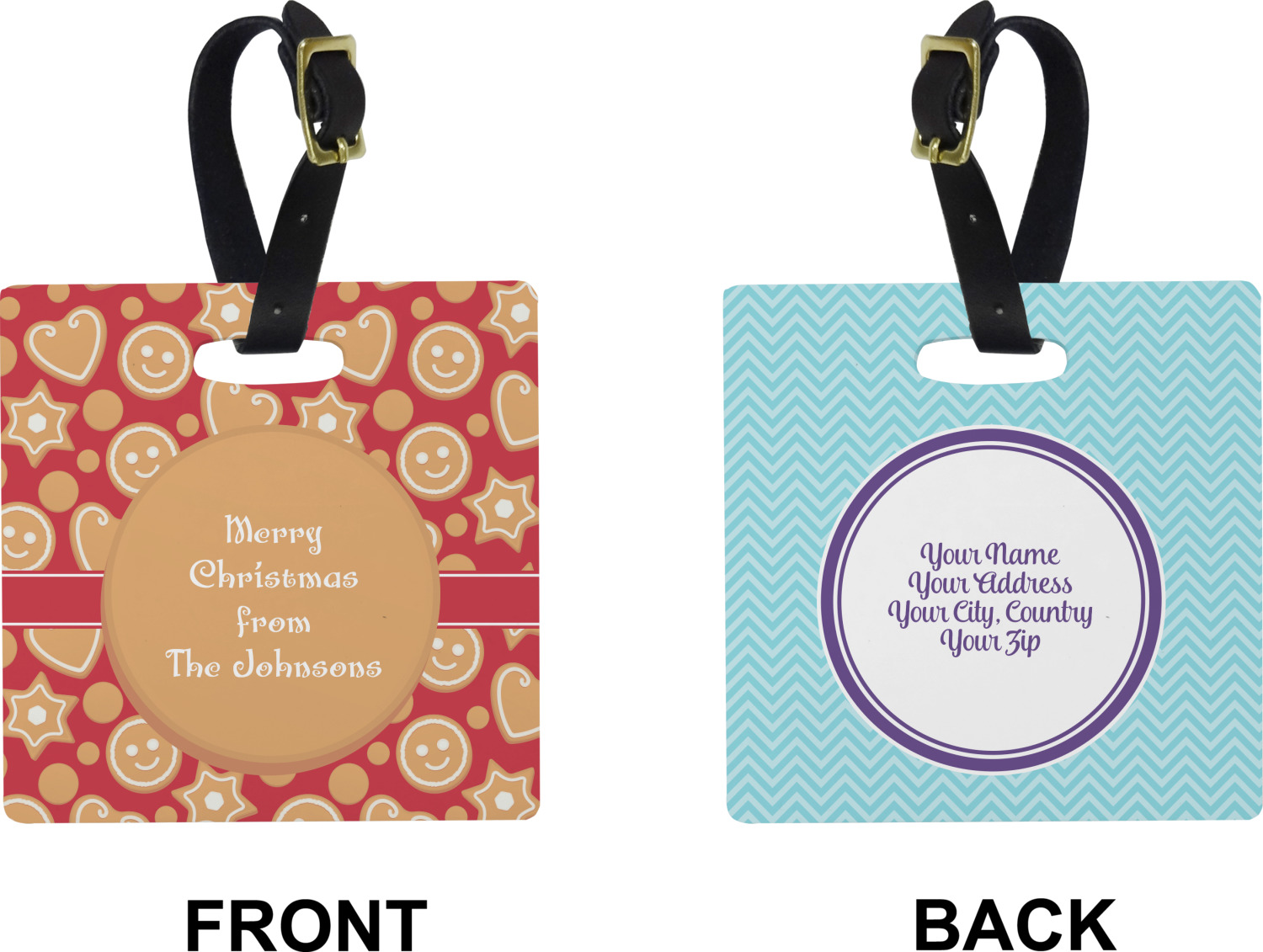These personalized bag tags are sold in a variety of shapes, so that you may find the product that meets your vision exactly. We sell a round luggage tag, which measures at approximately 4" x 4". Our square luggage tag is about 3.5" x 3.5", while our rectangular version is 2.75" x 4 ".
