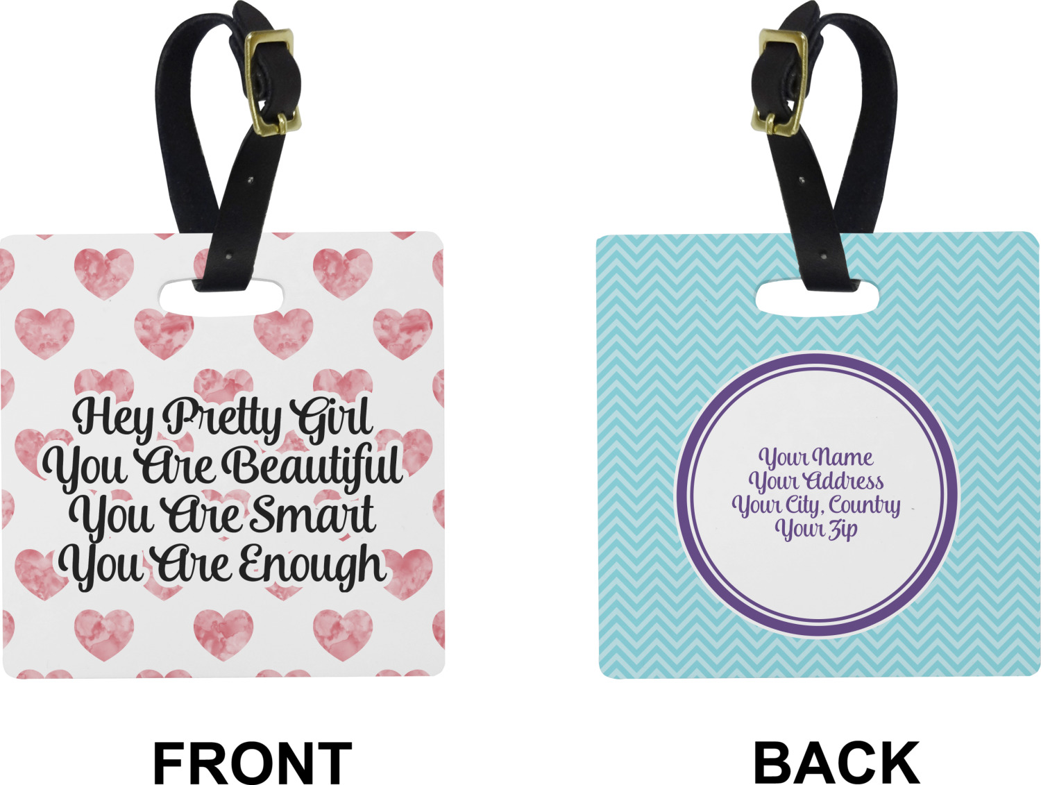 These personalized bag tags are sold in a variety of shapes, so that you may find the product that meets your vision exactly. We sell a round luggage tag, which measures at approximately 4" x 4". Our square luggage tag is about 3.5" x 3.5", while our rectangular version is 2.75" x 4 ".