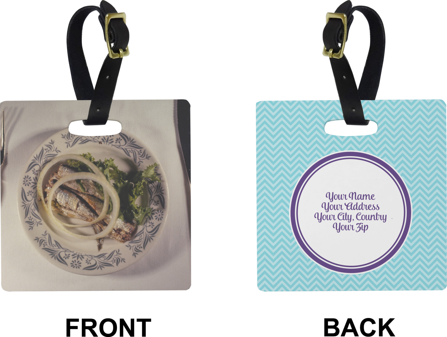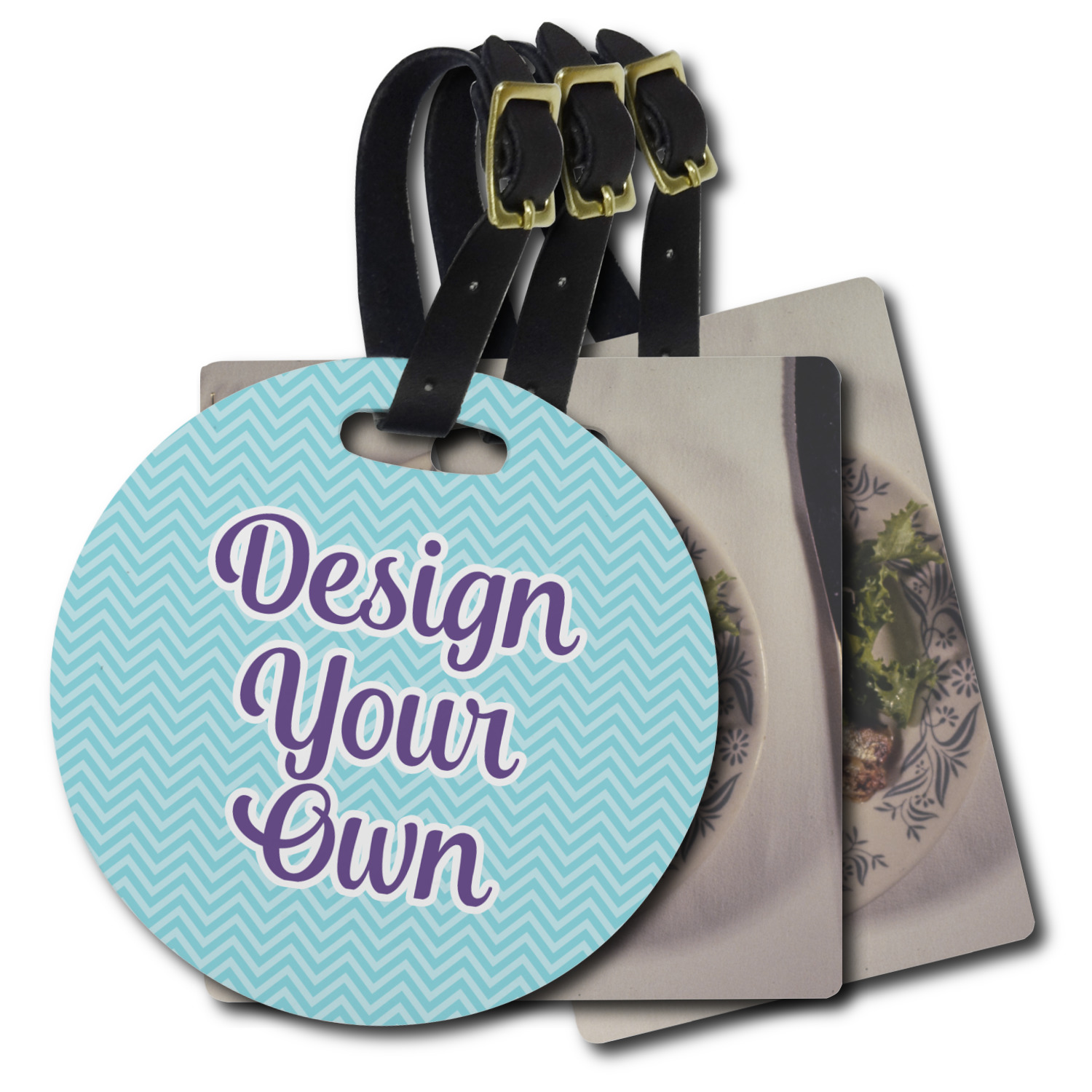 These personalized bag tags are sold in a variety of shapes, so that you may find the product that meets your vision exactly. We sell a round luggage tag, which measures at approximately 4" x 4". Our square luggage tag is about 3.5" x 3.5", while our rectangular version is 2.75" x 4 ".