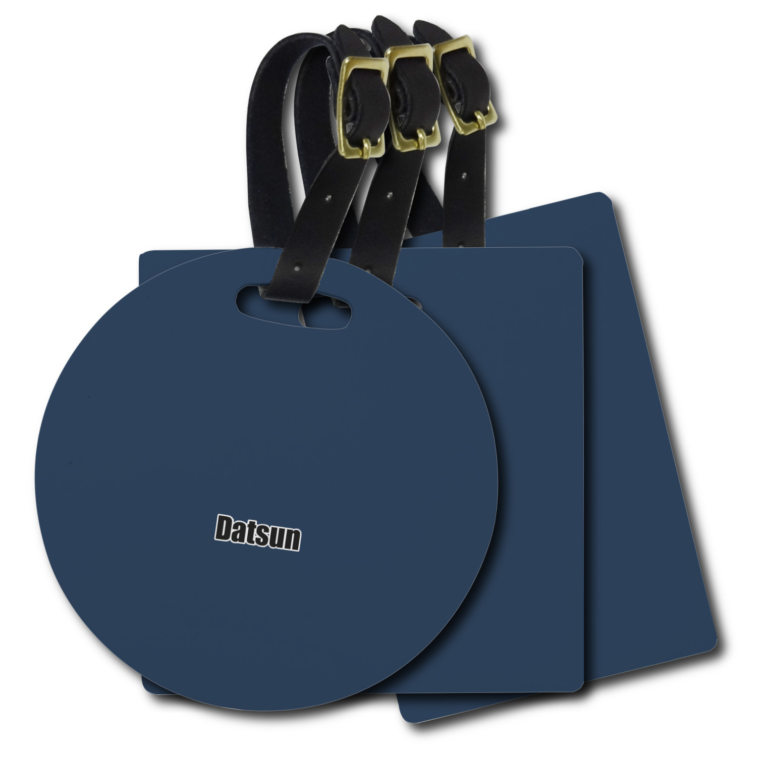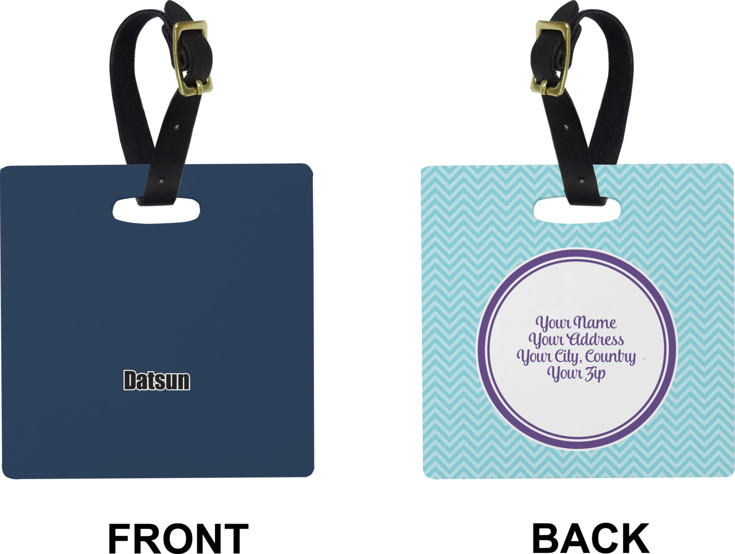 These personalized bag tags are sold in a variety of shapes, so that you may find the product that meets your vision exactly. We sell a round luggage tag, which measures at approximately 4" x 4". Our square luggage tag is about 3.5" x 3.5", while our rectangular version is 2.75" x 4 ".