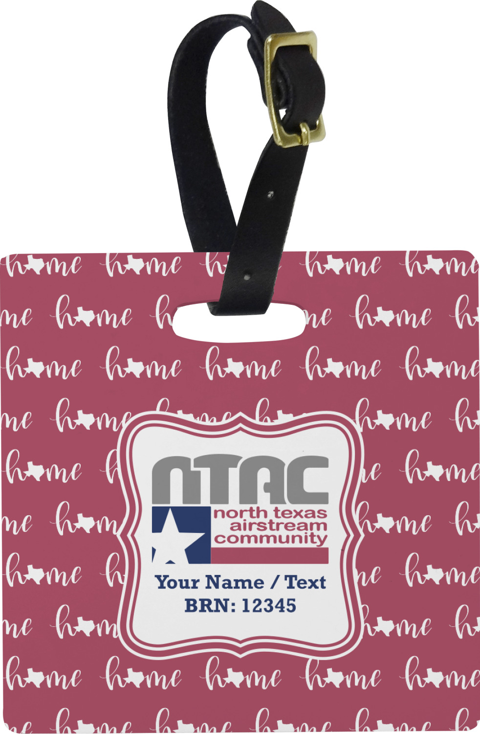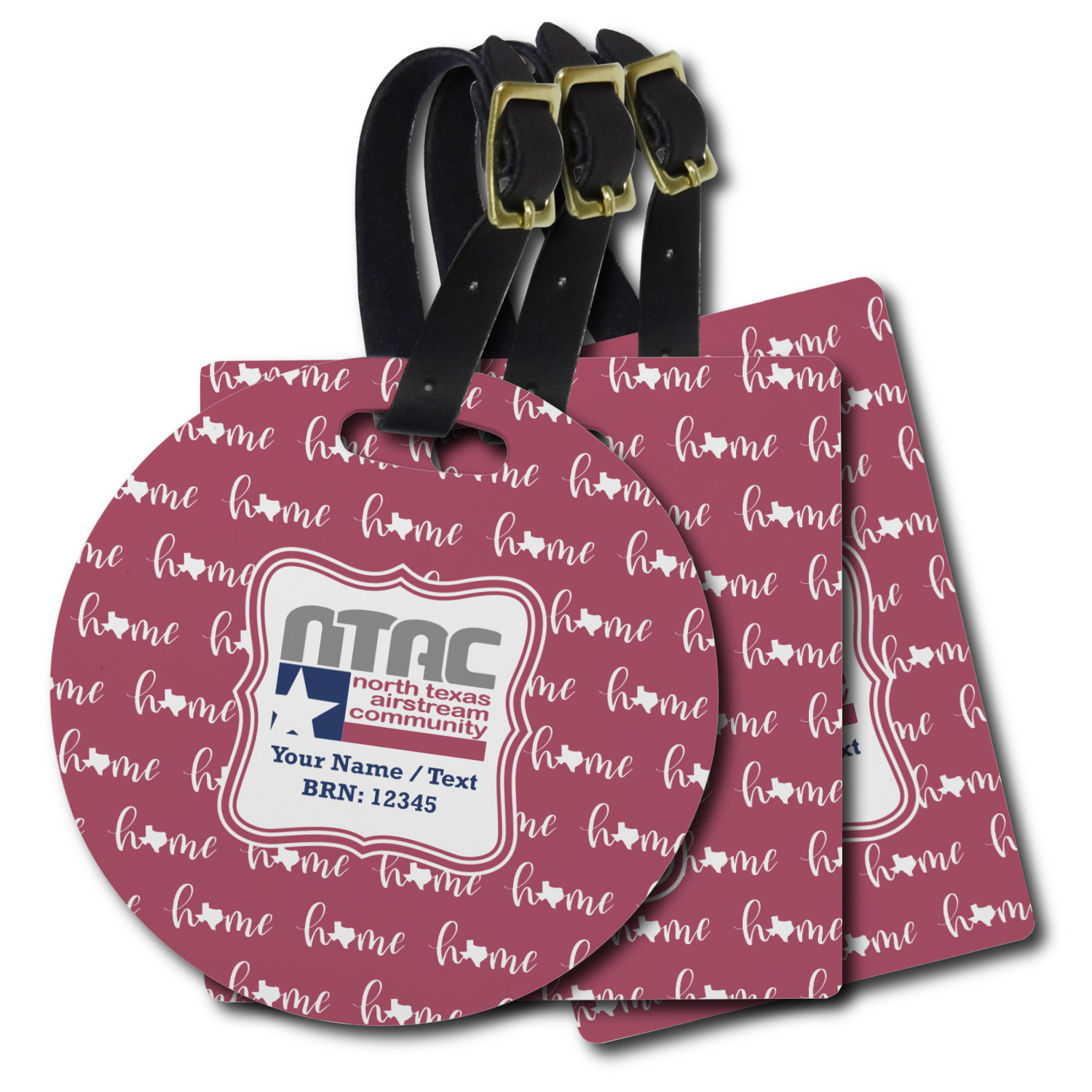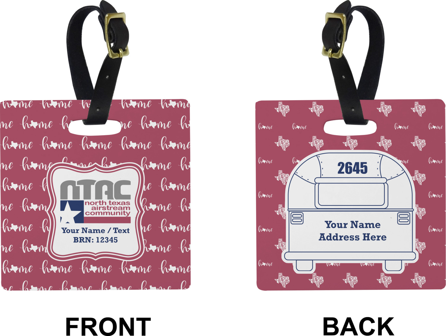 These personalized bag tags are sold in a variety of shapes, so that you may find the product that meets your vision exactly. We sell a round luggage tag, which measures at approximately 4" x 4". Our square luggage tag is about 3.5" x 3.5", while our rectangular version is 2.75" x 4 ".