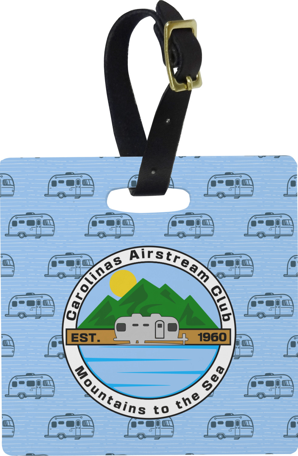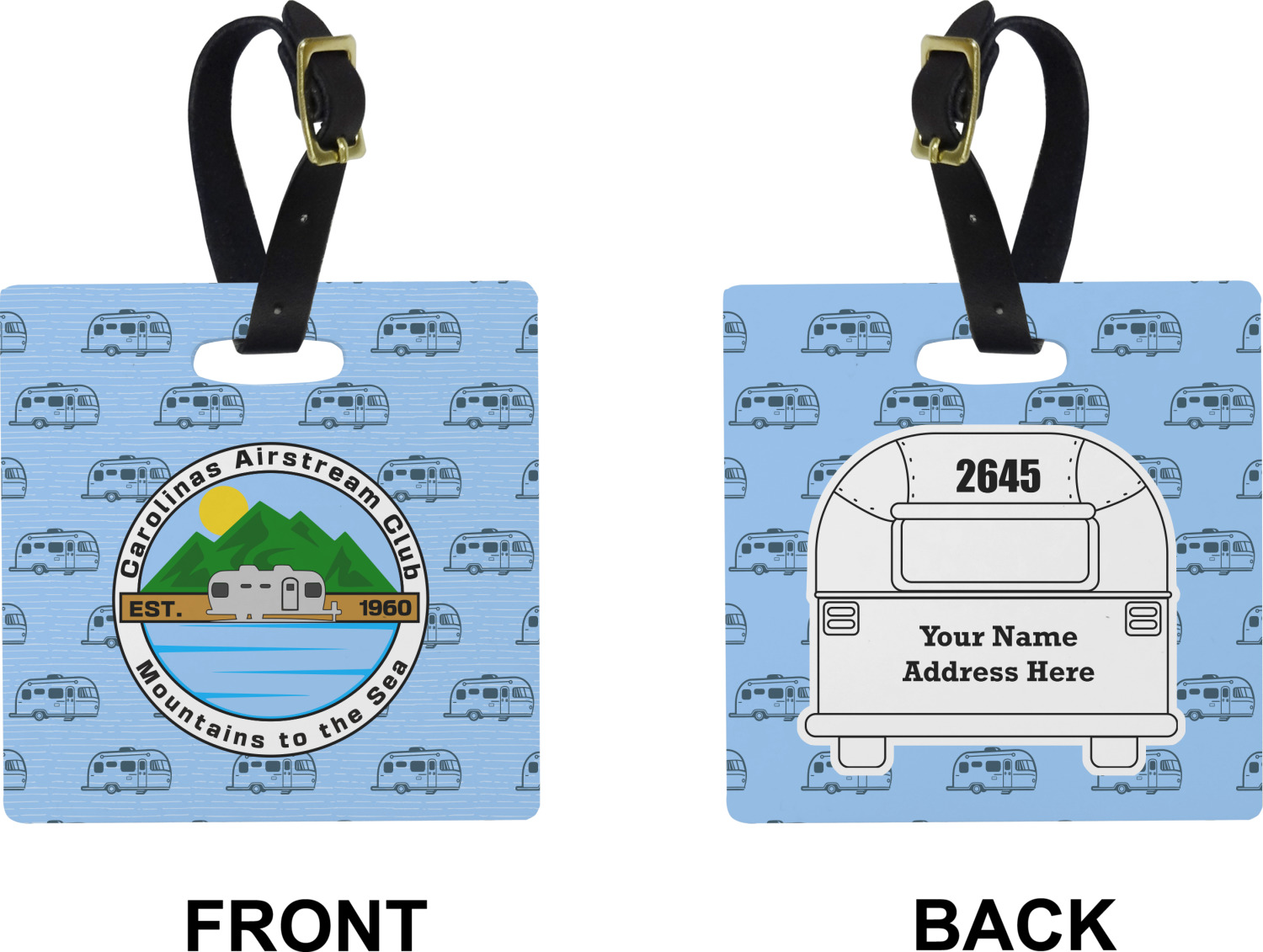 These personalized bag tags are sold in a variety of shapes, so that you may find the product that meets your vision exactly. We sell a round luggage tag, which measures at approximately 4" x 4". Our square luggage tag is about 3.5" x 3.5", while our rectangular version is 2.75" x 4 ".