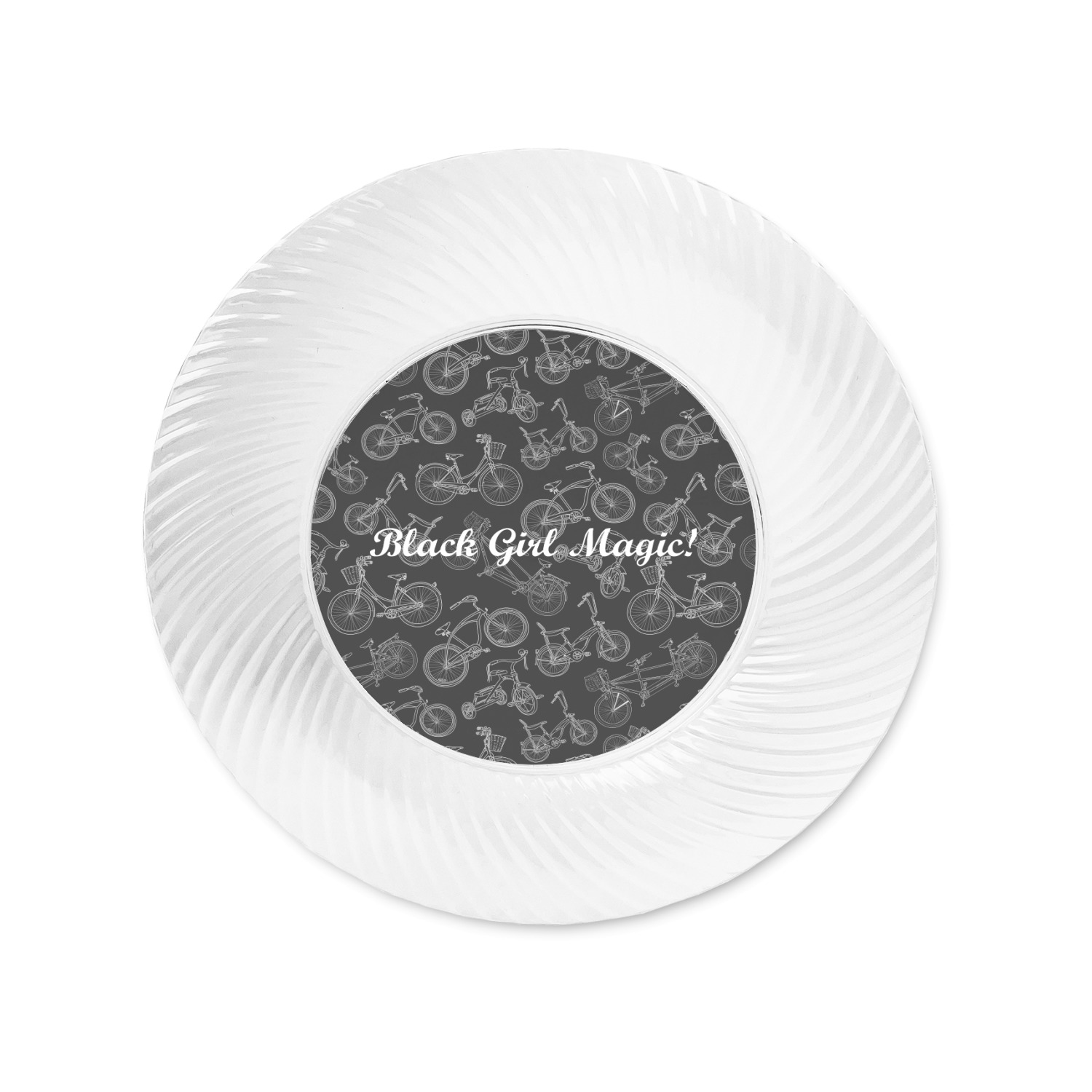 Made from a beautiful clear plastic plate as a base, your design is printed to the underside of the plate. The outside of the plate has a classic swirl texture to it for a high quality look and feel.