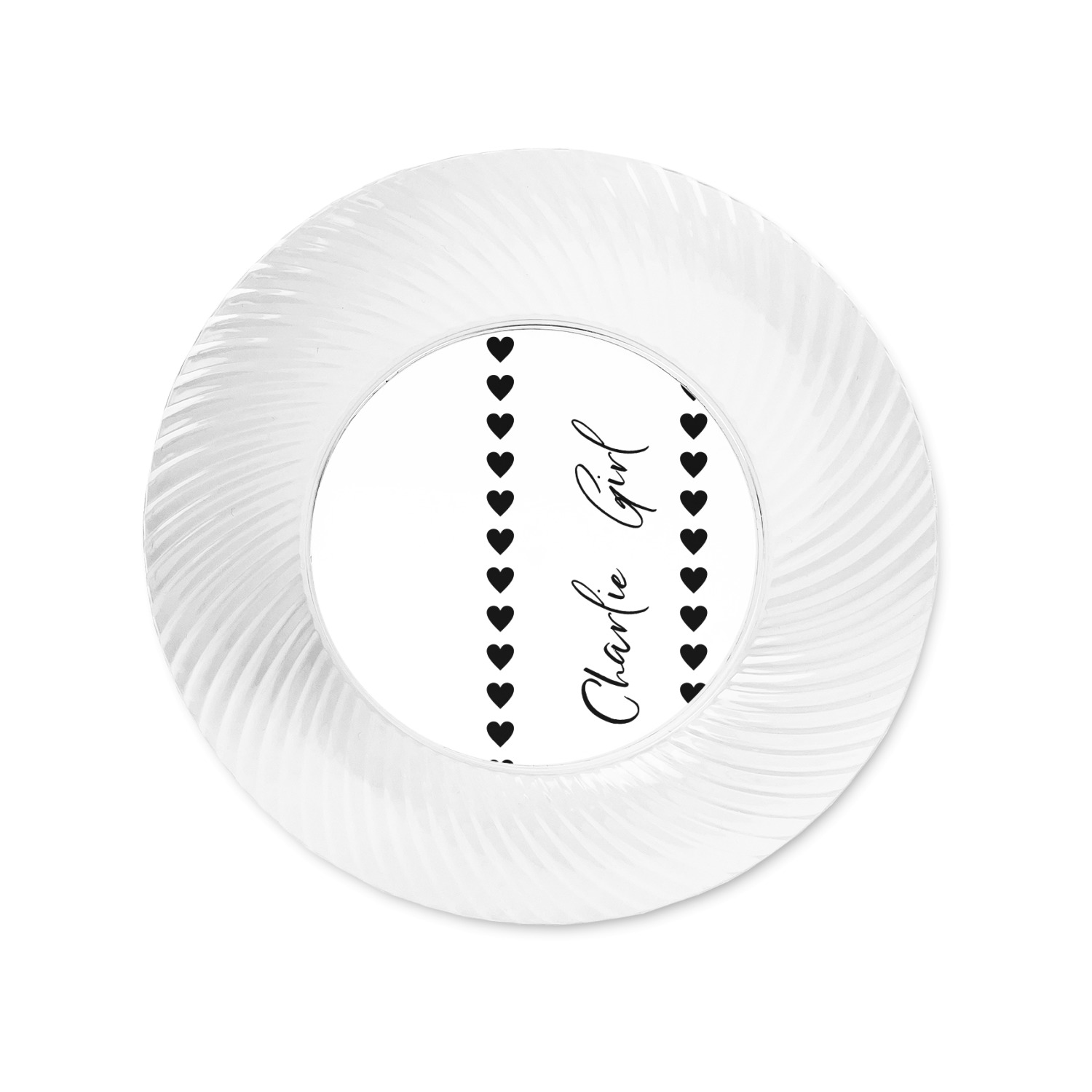 Made from a beautiful clear plastic plate as a base, your design is printed to the underside of the plate. The outside of the plate has a classic swirl texture to it for a high quality look and feel.