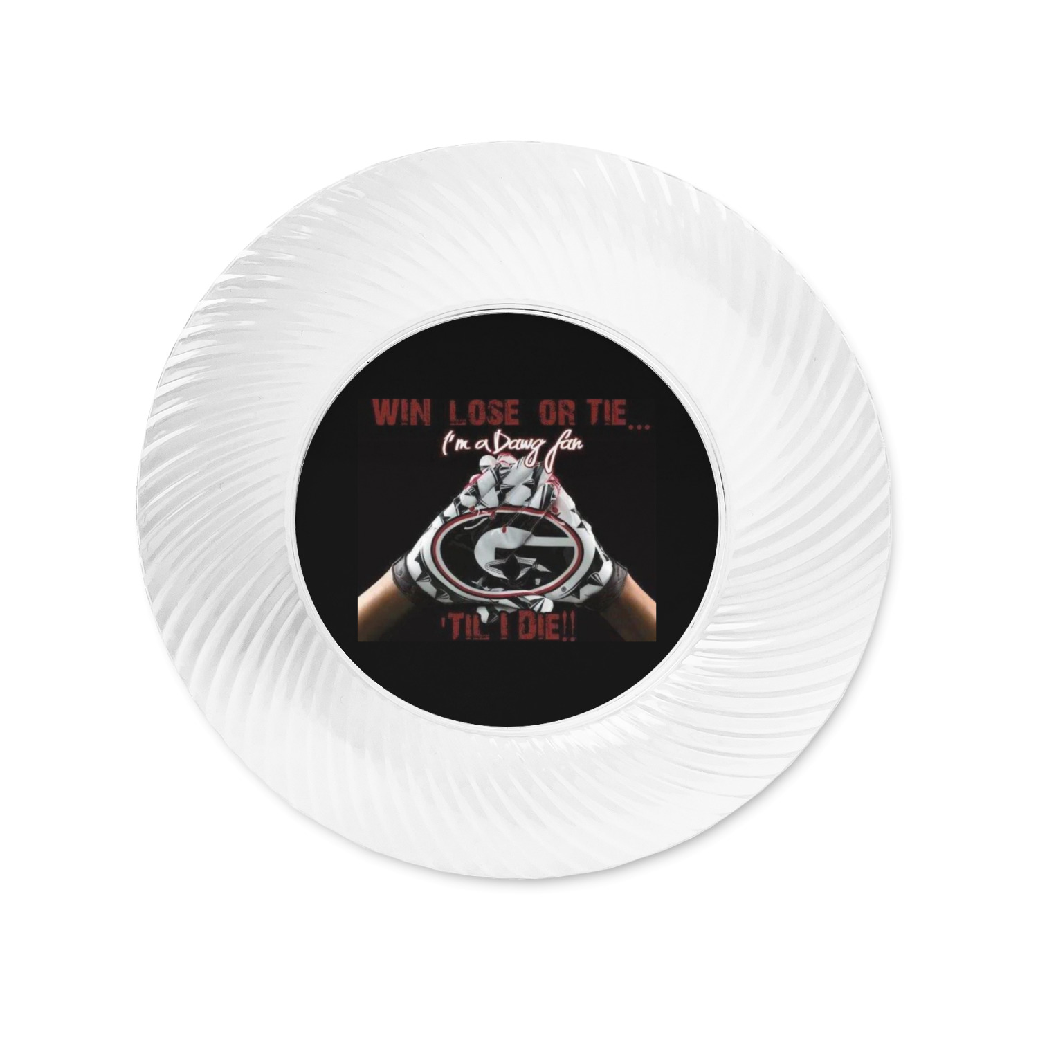 Made from a beautiful clear plastic plate as a base, your design is printed to the underside of the plate. The outside of the plate has a classic swirl texture to it for a high quality look and feel.