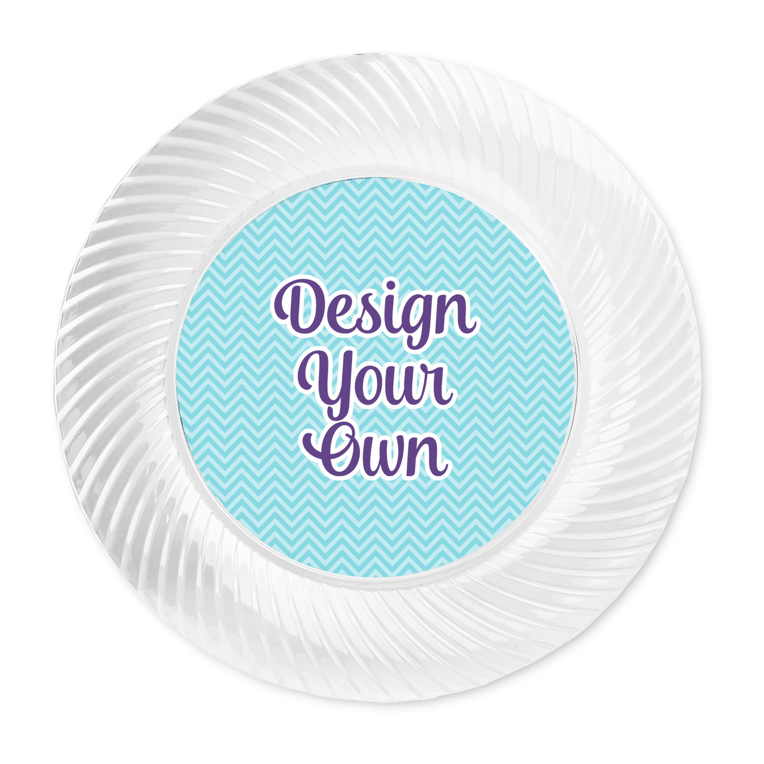 Made from a beautiful clear plastic plate as a base, your design is printed to the underside of the plate. The outside of these disposable plates has a classic swirl texture to it for a high quality look and feel.