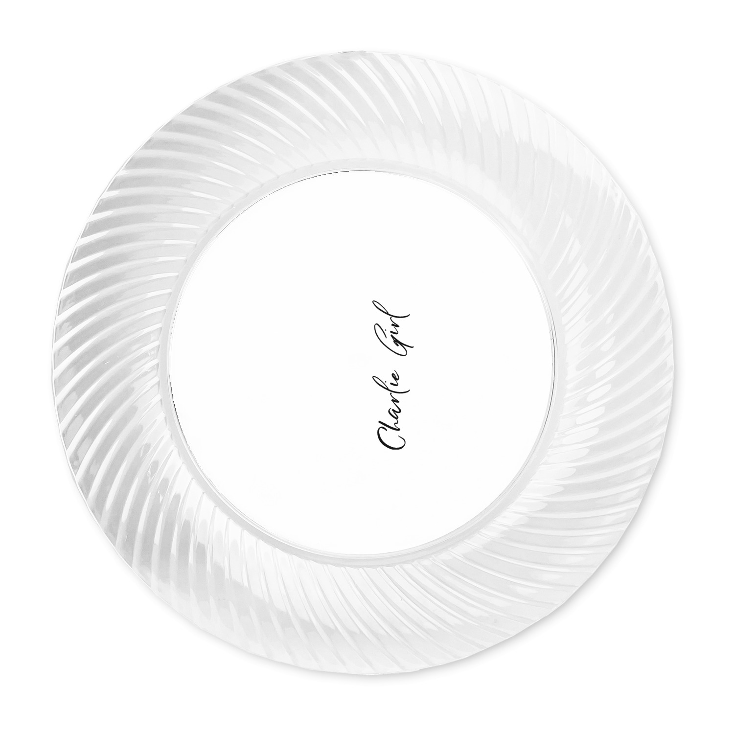 Made from a beautiful clear plastic plate as a base, your design is printed to the underside of the plate. The outside of these disposable plates has a classic swirl texture to it for a high quality look and feel.