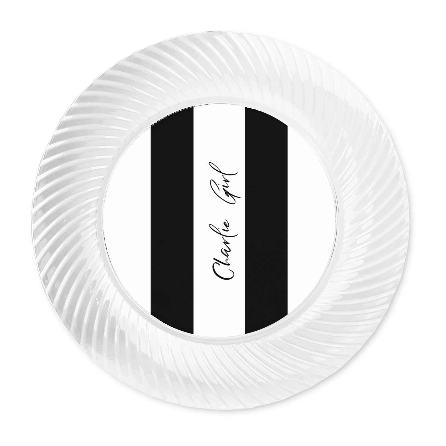 Made from a beautiful clear plastic plate as a base, your design is printed to the underside of the plate. The outside of these disposable plates has a classic swirl texture to it for a high quality look and feel.