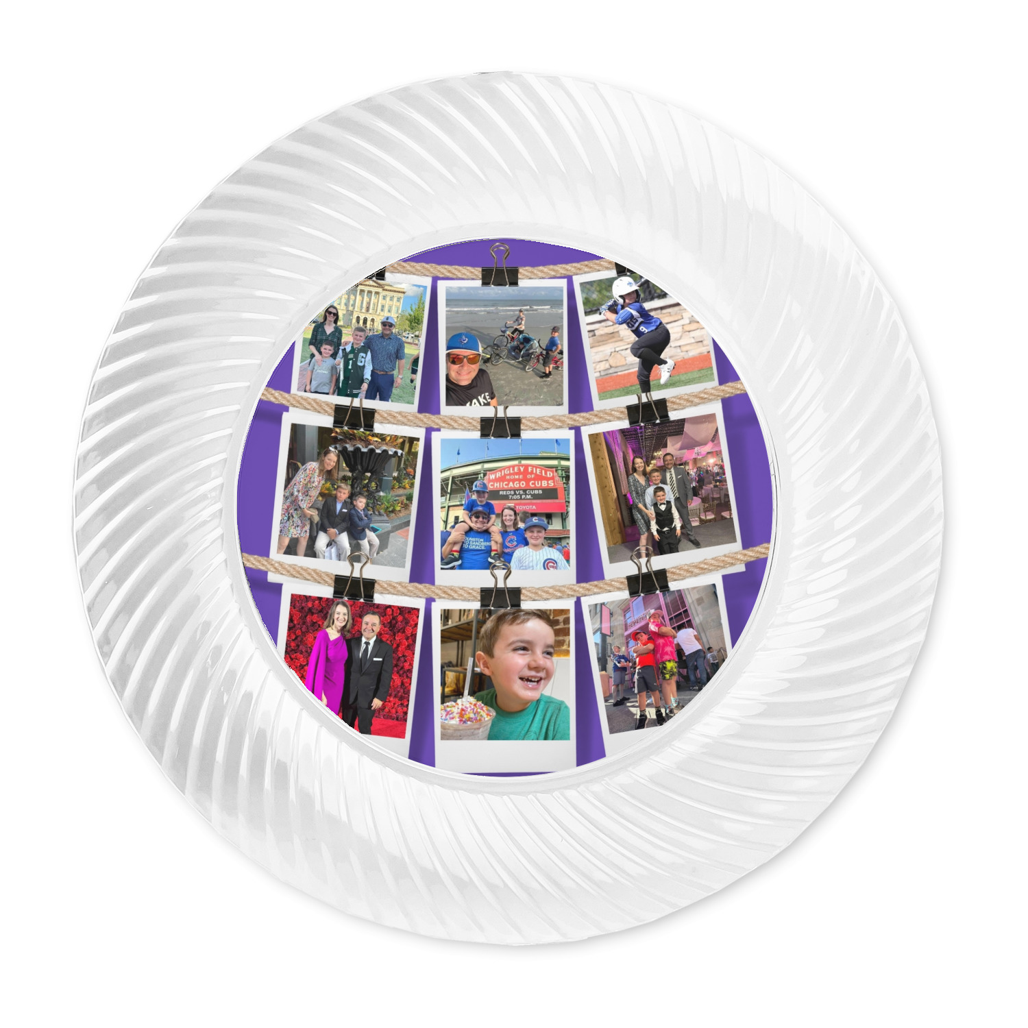 Made from a beautiful clear plastic plate as a base, your design is printed to the underside of the plate. The outside of these disposable plates has a classic swirl texture to it for a high quality look and feel.