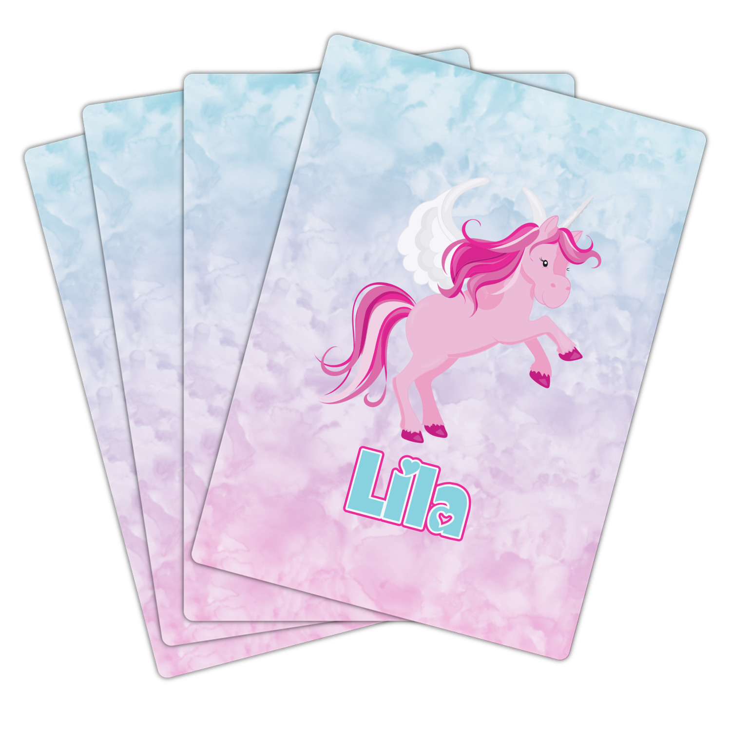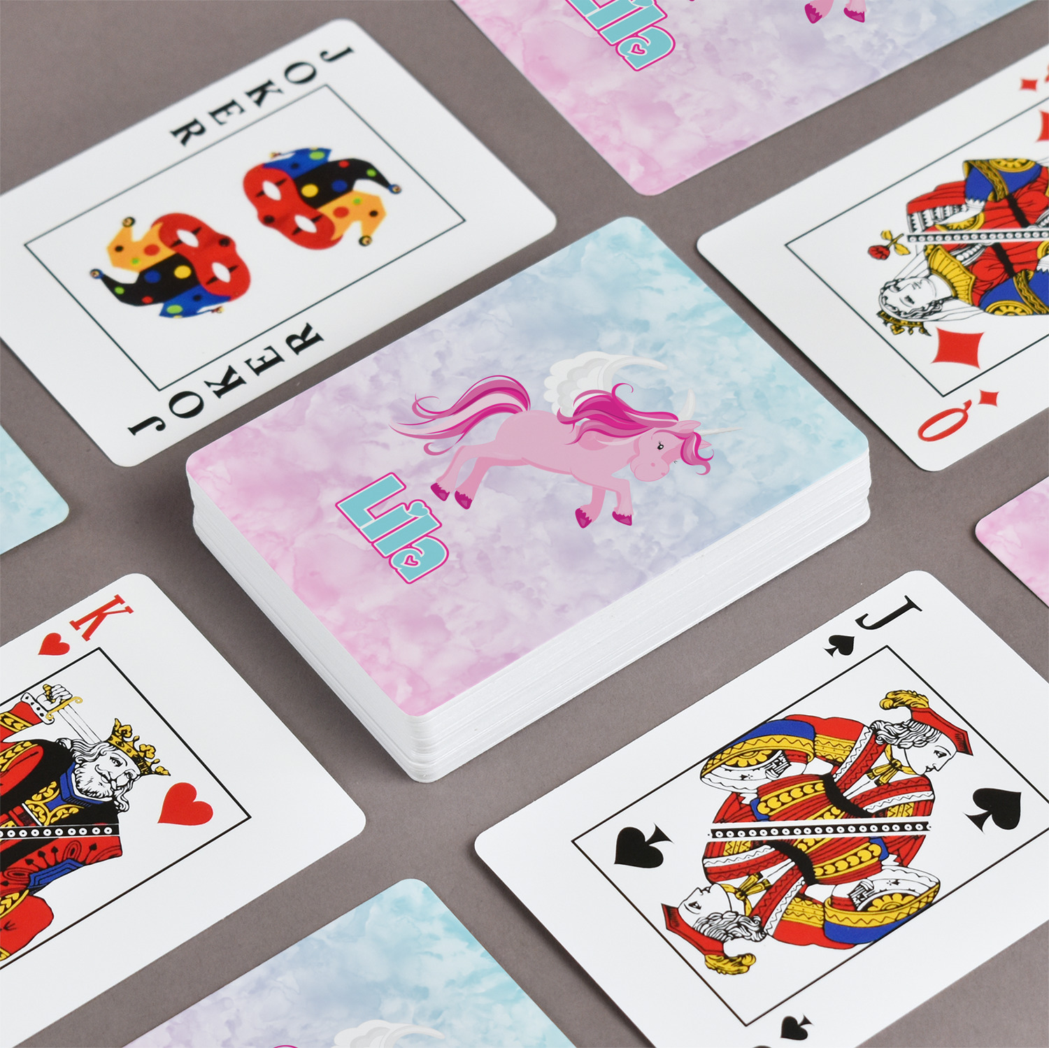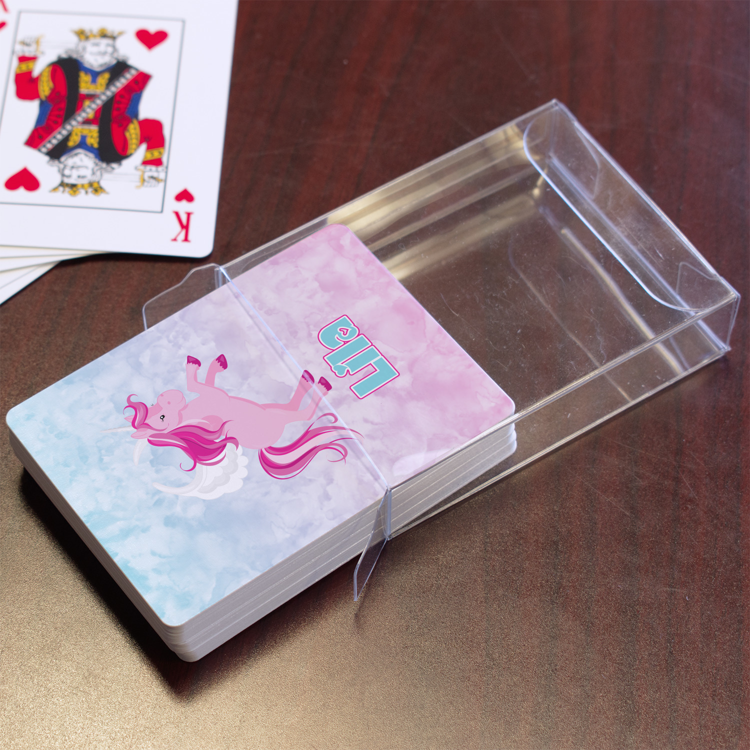 The customization / personalization is printed on the back side. The playing cards have a low gloss coating on both sides. The cards are packaged in a clear plastic box.