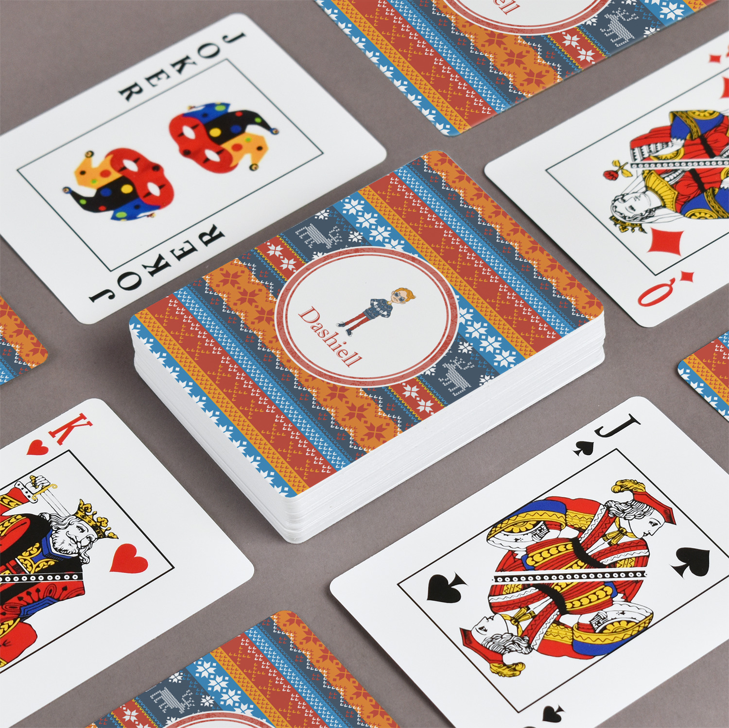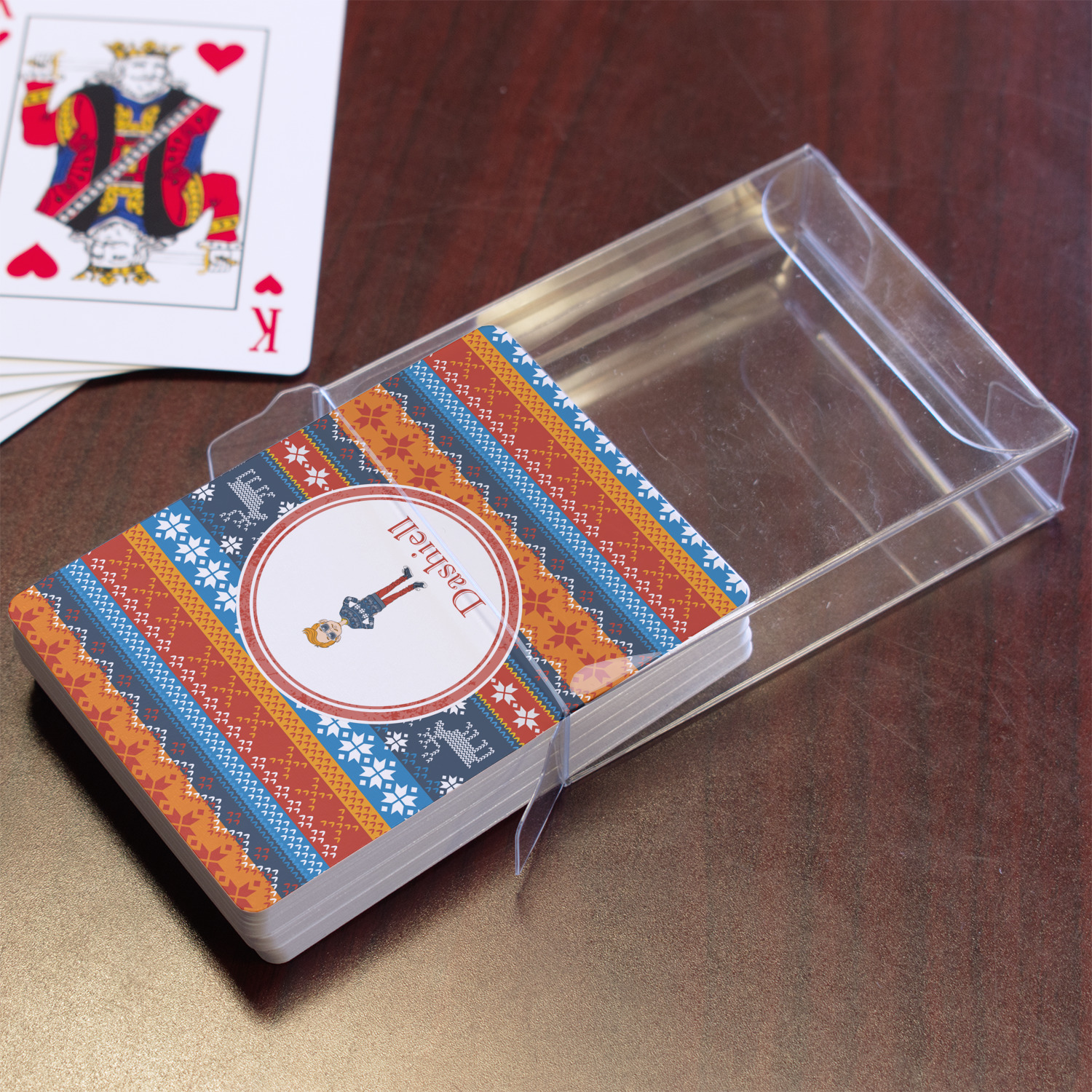 The customization / personalization is printed on the back side. The playing cards have a low gloss coating on both sides. The cards are packaged in a clear plastic box.