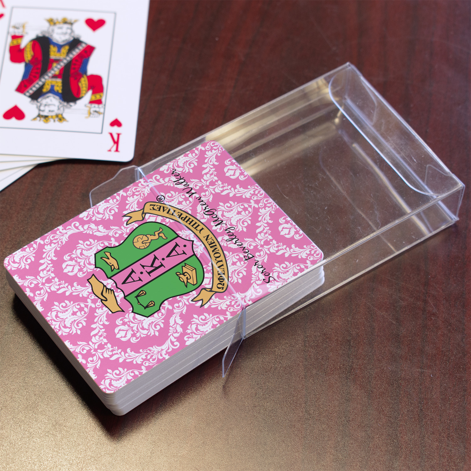 The customization / personalization is printed on the back side. The playing cards have a low gloss coating on both sides. The cards are packaged in a clear plastic box.