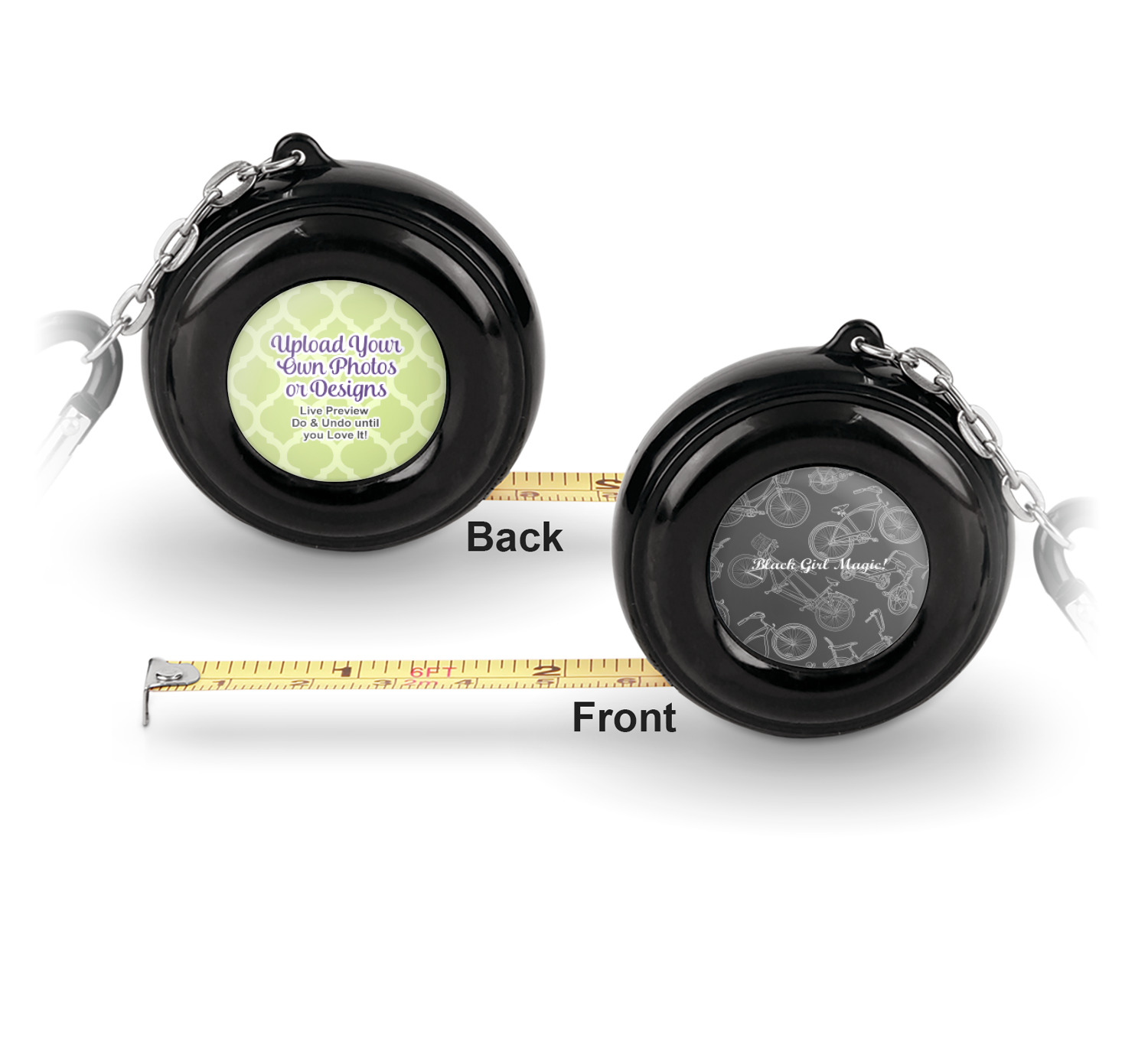 Now for personalizing! You get to personalize both sides of your tape measure. Have fun picking a cute pattern, font, or graphic! Make your personality shine through this fun tool.