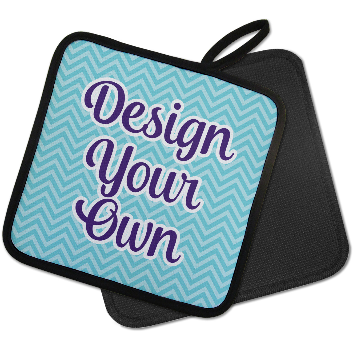 Our personalized pot holders feature a neoprene front that displays your personalization in vibrant colors. The backing of the hot pot holder is rubberized; the textured backing allows you to have a great grip when using this custom pot holder. The two materials are joined with a sleek, black trim, and the holder also includes an attached loop for hanging and storage. The pot holder is approximately 8.75 inches by 8.75 inches and 0.25 inches tall, while the fabric loop is 2.5 inches long. You can purchase a kitchen pot holder by itself or as a set of 2. We also offer a set including one pot holder and one oven mitt.