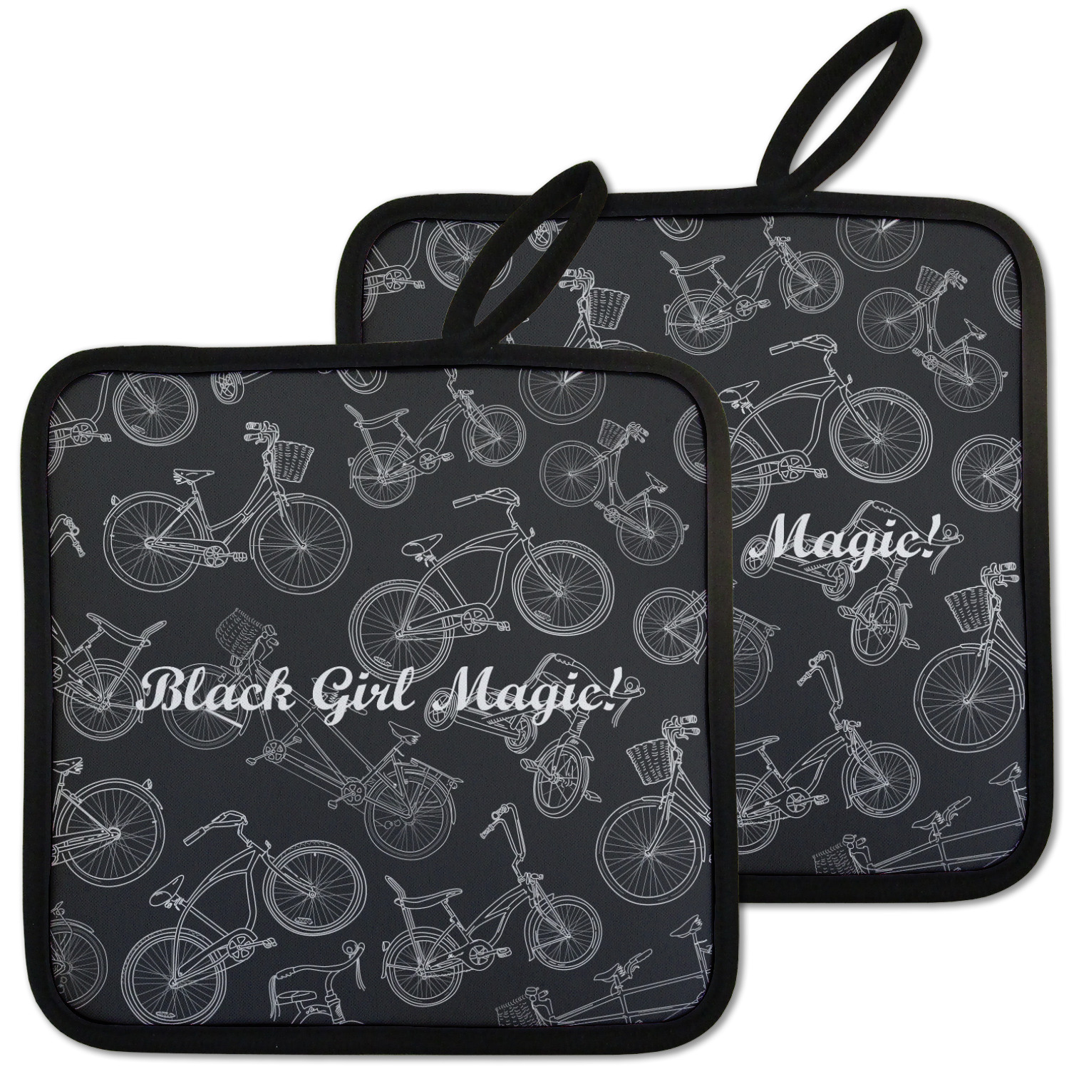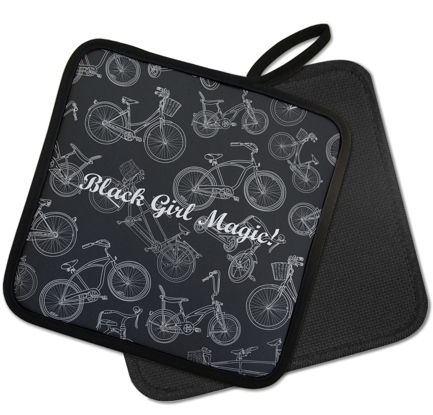 Our personalized pot holders feature a neoprene front that displays your personalization in vibrant colors. The backing of the hot pot holder is rubberized; the textured backing allows you to have a great grip when using this custom pot holder. The two materials are joined with a sleek, black trim, and the holder also includes an attached loop for hanging and storage. The pot holder is approximately 8.75 inches by 8.75 inches and 0.25 inches tall, while the fabric loop is 2.5 inches long. You can purchase a kitchen pot holder by itself or as a set of 2. We also offer a set including one pot holder and one oven mitt.