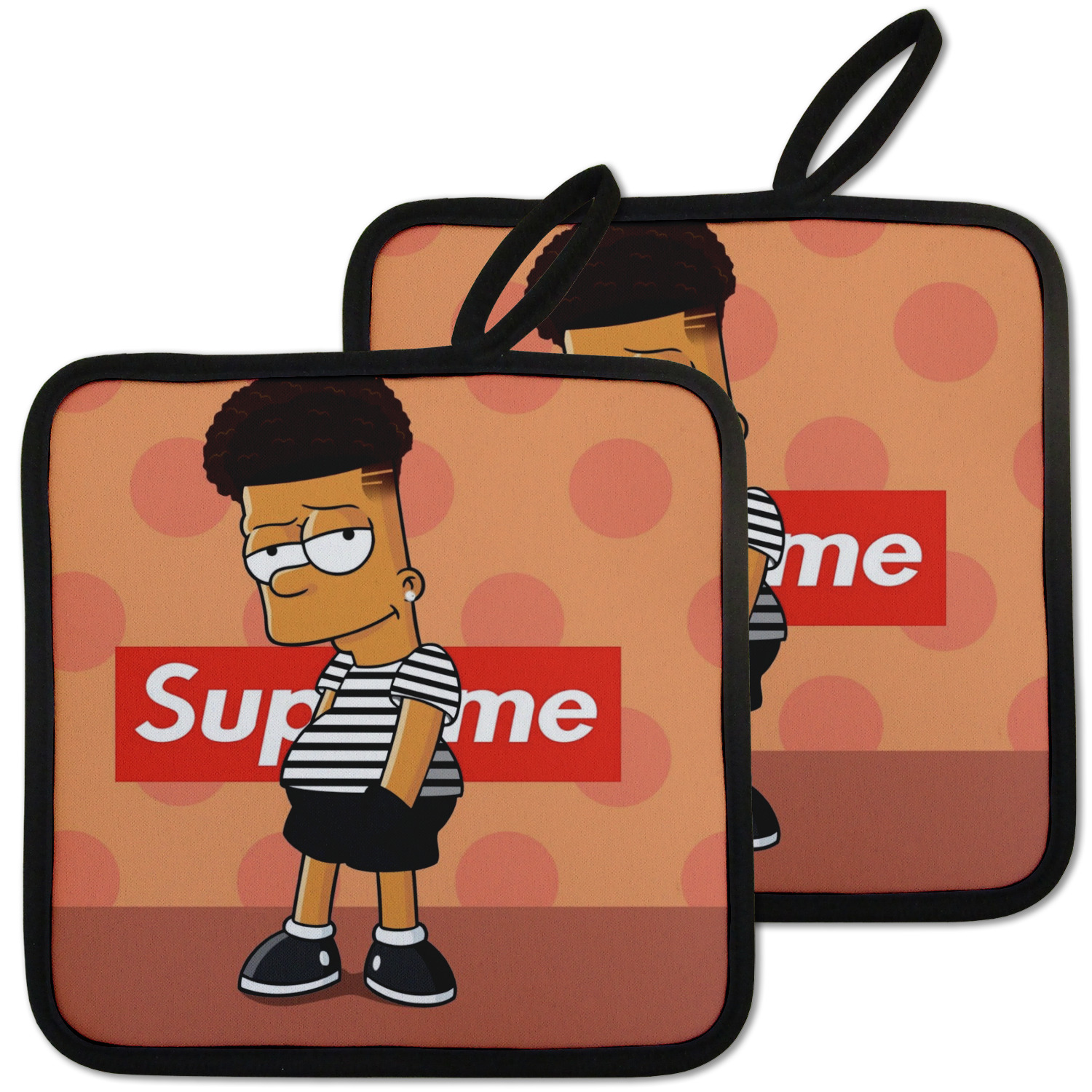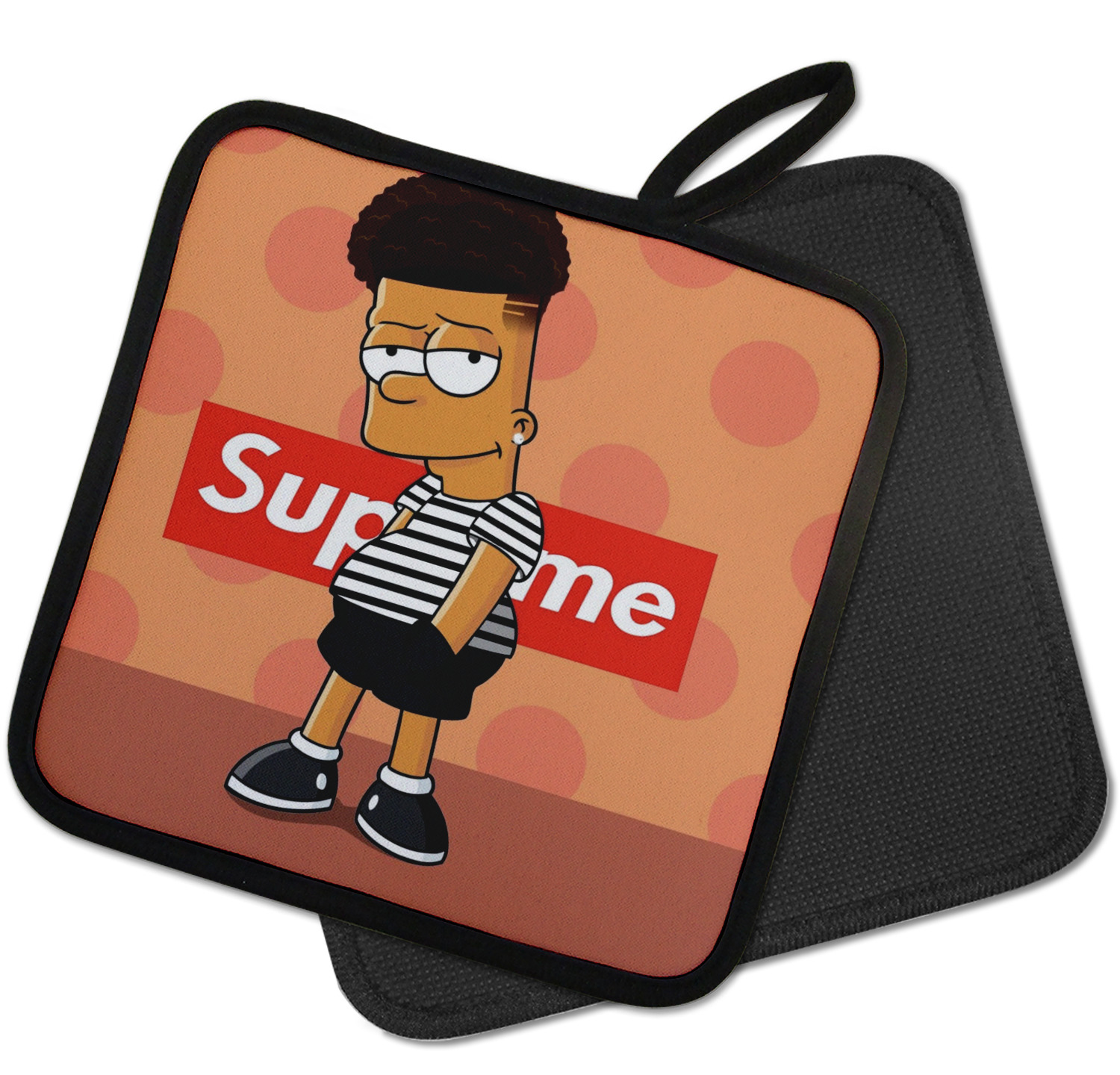 Our personalized pot holders feature a neoprene front that displays your personalization in vibrant colors. The backing of the hot pot holder is rubberized; the textured backing allows you to have a great grip when using this custom pot holder. The two materials are joined with a sleek, black trim, and the holder also includes an attached loop for hanging and storage. The pot holder is approximately 8.75 inches by 8.75 inches and 0.25 inches tall, while the fabric loop is 2.5 inches long. You can purchase a kitchen pot holder by itself or as a set of 2. We also offer a set including one pot holder and one oven mitt.