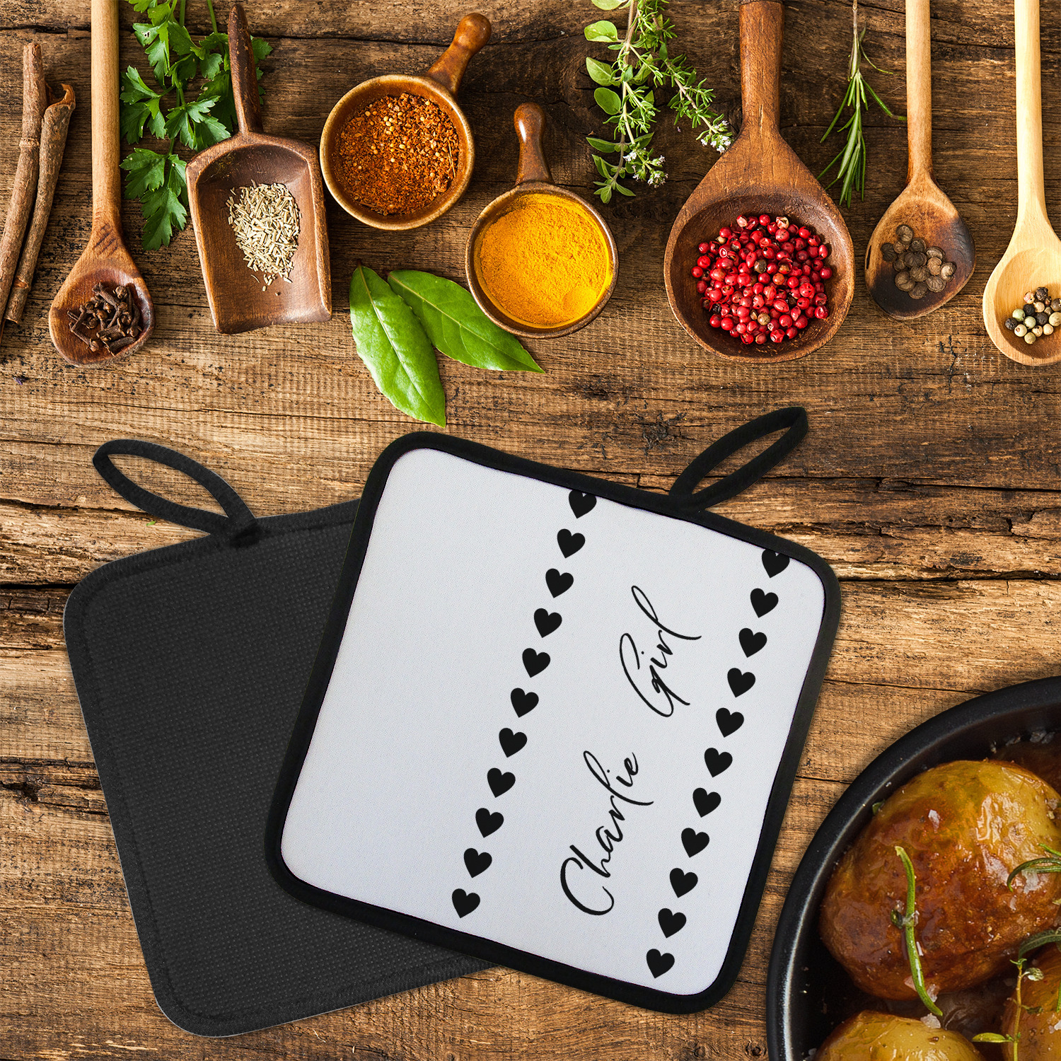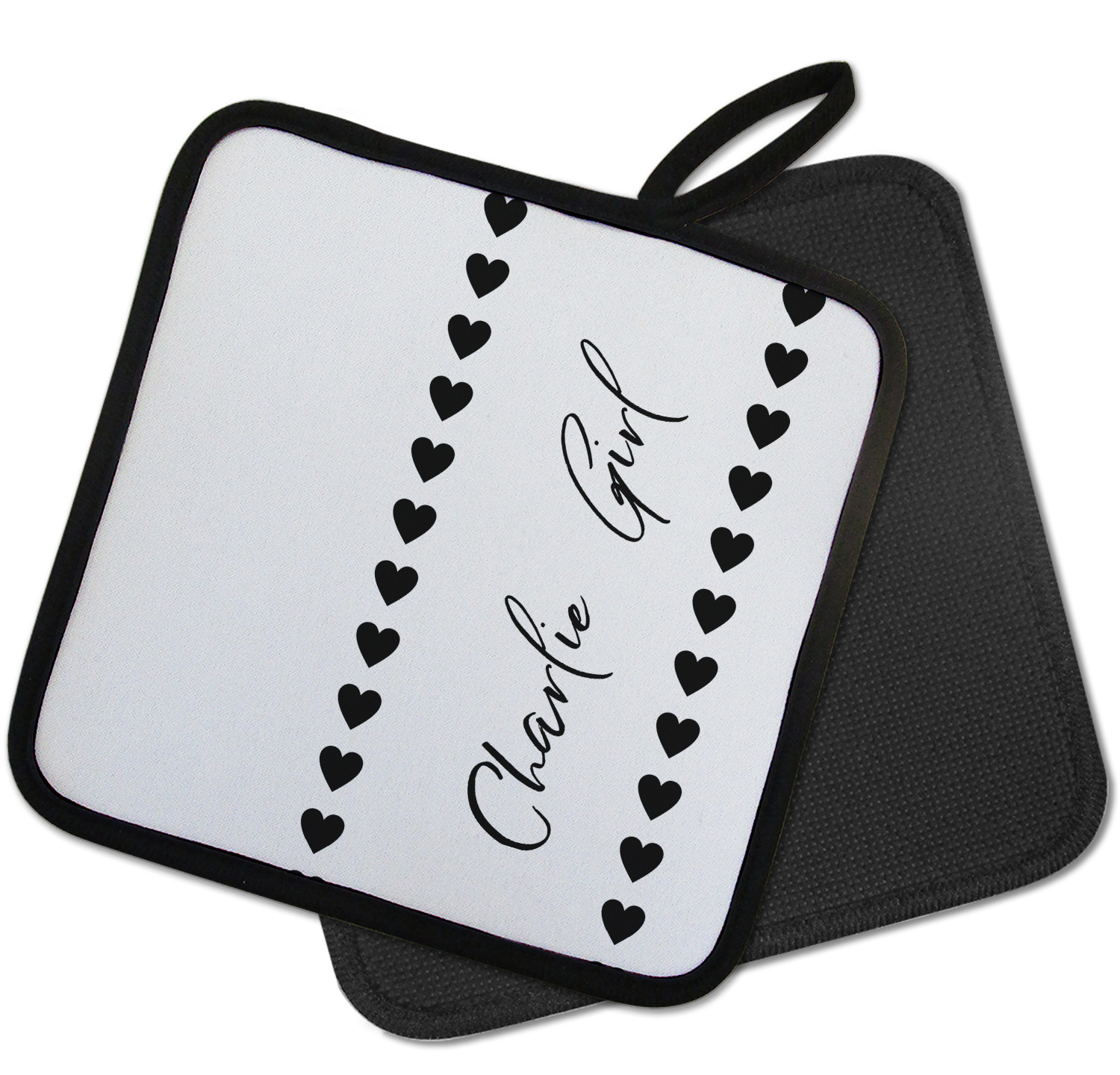 Our personalized pot holders feature a neoprene front that displays your personalization in vibrant colors. The backing of the hot pot holder is rubberized; the textured backing allows you to have a great grip when using this custom pot holder. The two materials are joined with a sleek, black trim, and the holder also includes an attached loop for hanging and storage. The pot holder is approximately 8.75 inches by 8.75 inches and 0.25 inches tall, while the fabric loop is 2.5 inches long. You can purchase a kitchen pot holder by itself or as a set of 2. We also offer a set including one pot holder and one oven mitt.