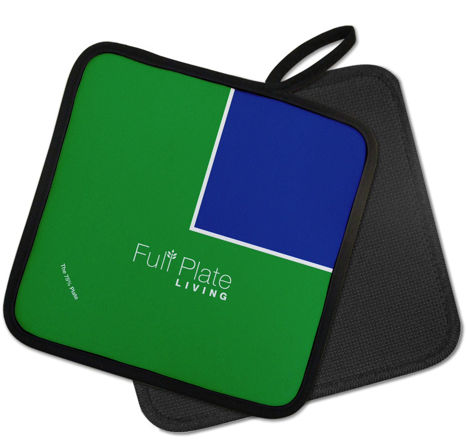 Our personalized pot holders feature a neoprene front that displays your personalization in vibrant colors. The backing of the hot pot holder is rubberized; the textured backing allows you to have a great grip when using this custom pot holder. The two materials are joined with a sleek, black trim, and the holder also includes an attached loop for hanging and storage. The pot holder is approximately 8.75 inches by 8.75 inches and 0.25 inches tall, while the fabric loop is 2.5 inches long. You can purchase a kitchen pot holder by itself or as a set of 2. We also offer a set including one pot holder and one oven mitt.