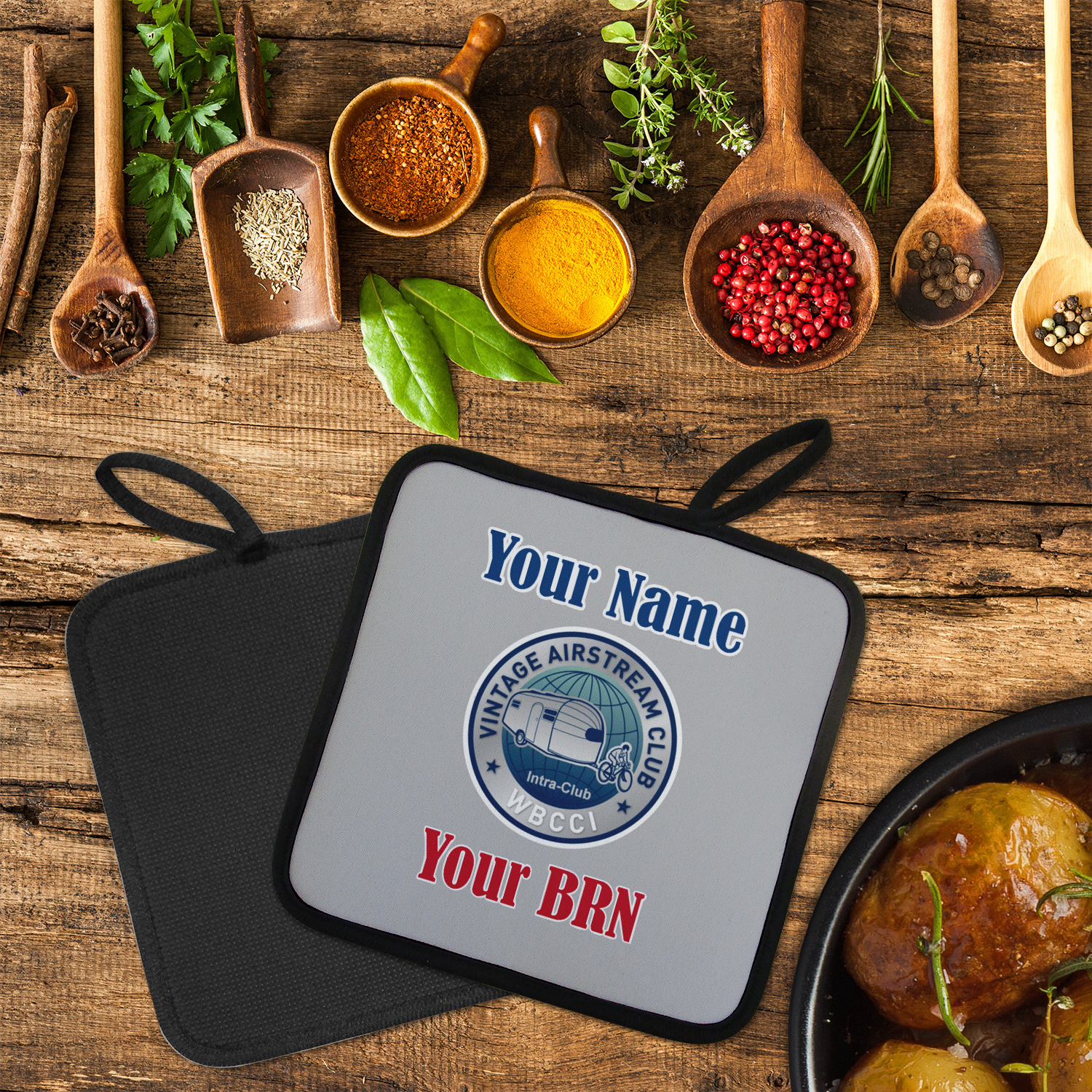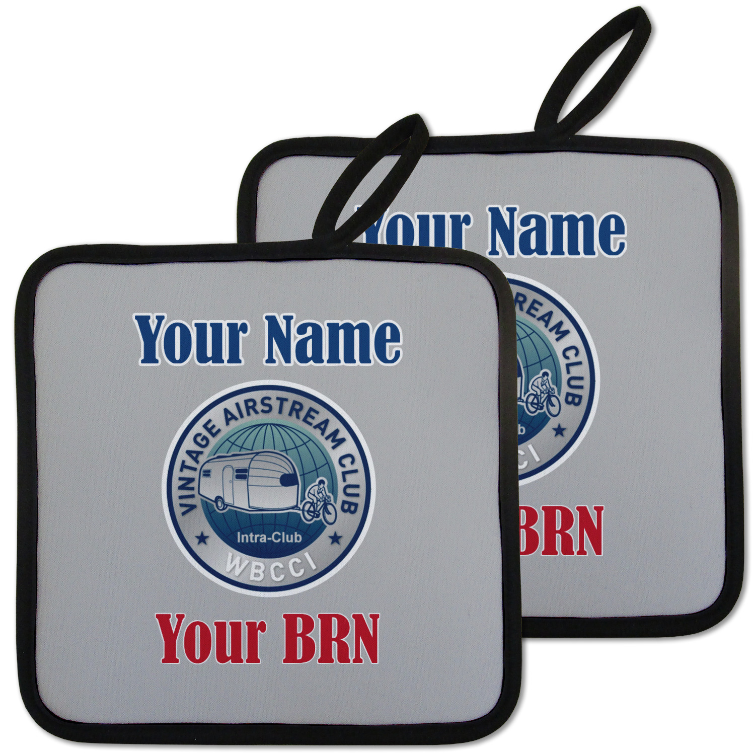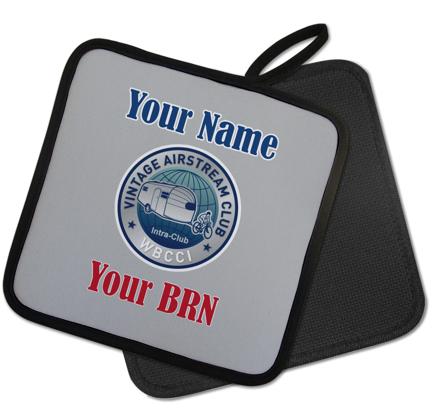 Our personalized pot holders feature a neoprene front that displays your personalization in vibrant colors. The backing of the hot pot holder is rubberized; the textured backing allows you to have a great grip when using this custom pot holder. The two materials are joined with a sleek, black trim, and the holder also includes an attached loop for hanging and storage. The pot holder is approximately 8.75 inches by 8.75 inches and 0.25 inches tall, while the fabric loop is 2.5 inches long. You can purchase a kitchen pot holder by itself or as a set of 2. We also offer a set including one pot holder and one oven mitt.
