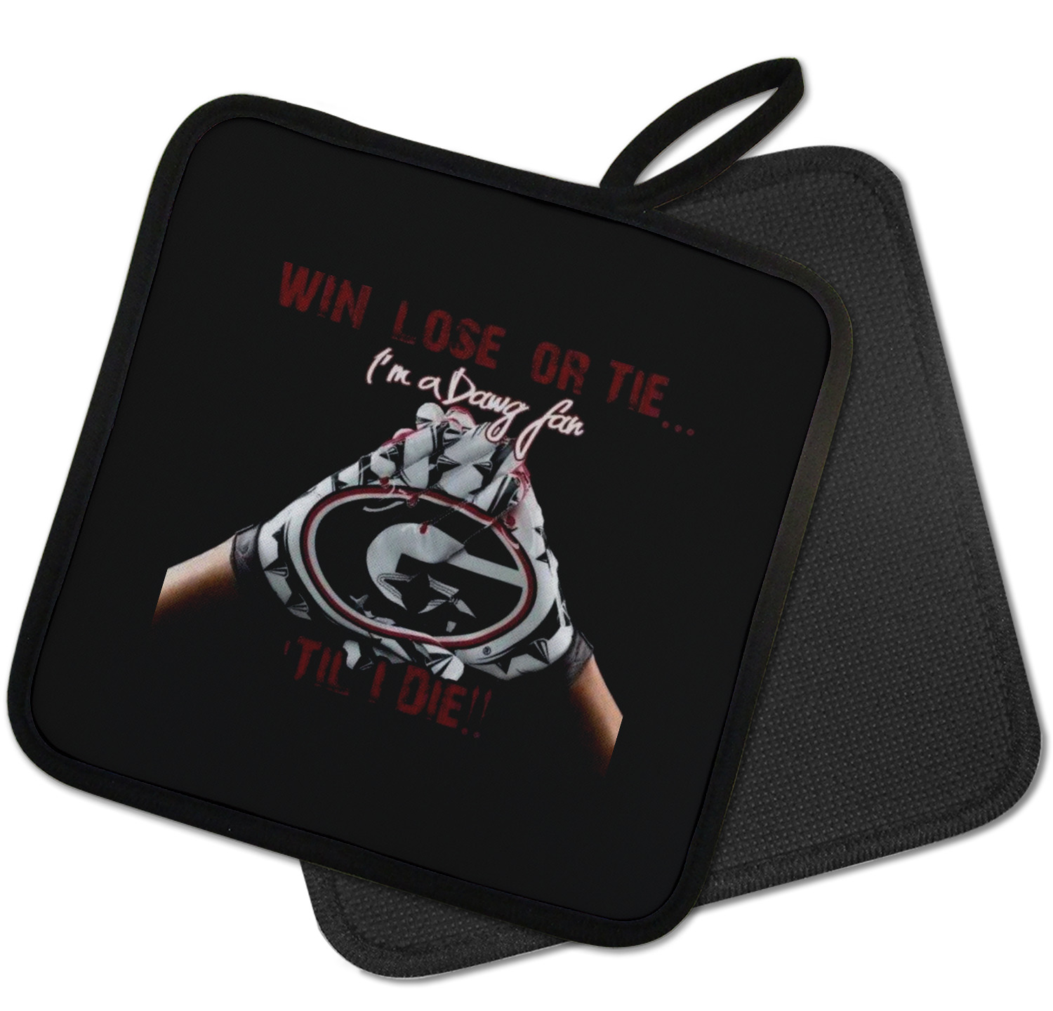 Our personalized pot holders feature a neoprene front that displays your personalization in vibrant colors. The backing of the hot pot holder is rubberized; the textured backing allows you to have a great grip when using this custom pot holder. The two materials are joined with a sleek, black trim, and the holder also includes an attached loop for hanging and storage. The pot holder is approximately 8.75 inches by 8.75 inches and 0.25 inches tall, while the fabric loop is 2.5 inches long. You can purchase a kitchen pot holder by itself or as a set of 2. We also offer a set including one pot holder and one oven mitt.