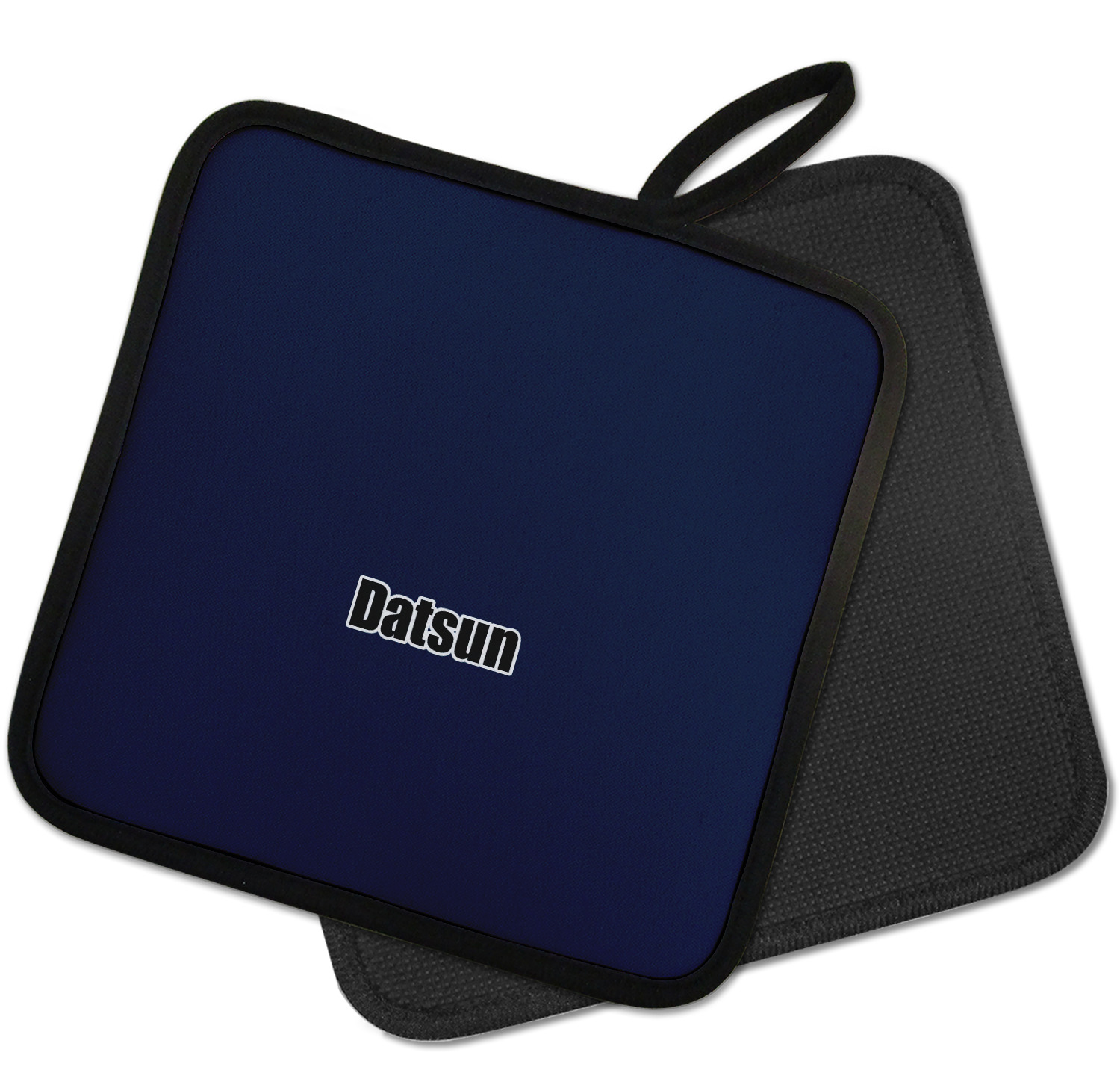 Our personalized pot holders feature a neoprene front that displays your personalization in vibrant colors. The backing of the hot pot holder is rubberized; the textured backing allows you to have a great grip when using this custom pot holder. The two materials are joined with a sleek, black trim, and the holder also includes an attached loop for hanging and storage. The pot holder is approximately 8.75 inches by 8.75 inches and 0.25 inches tall, while the fabric loop is 2.5 inches long. You can purchase a kitchen pot holder by itself or as a set of 2. We also offer a set including one pot holder and one oven mitt.