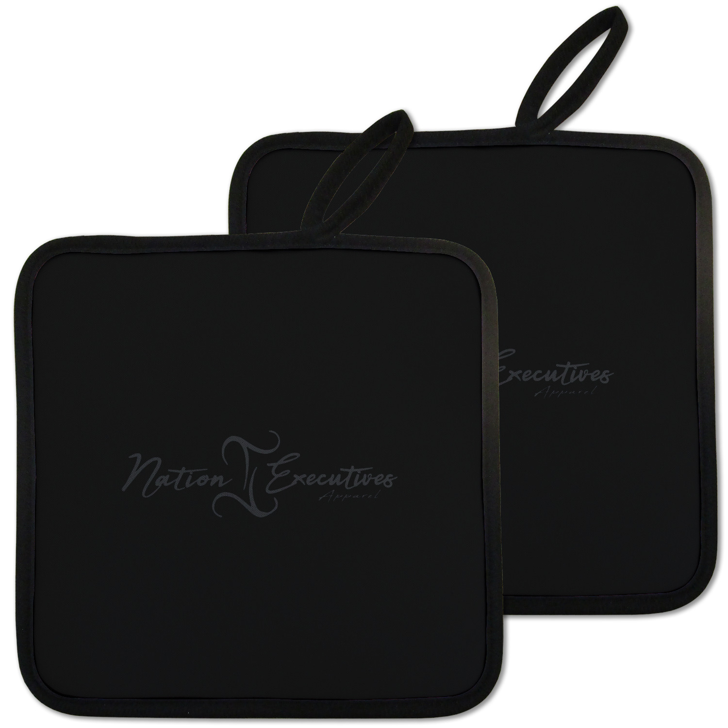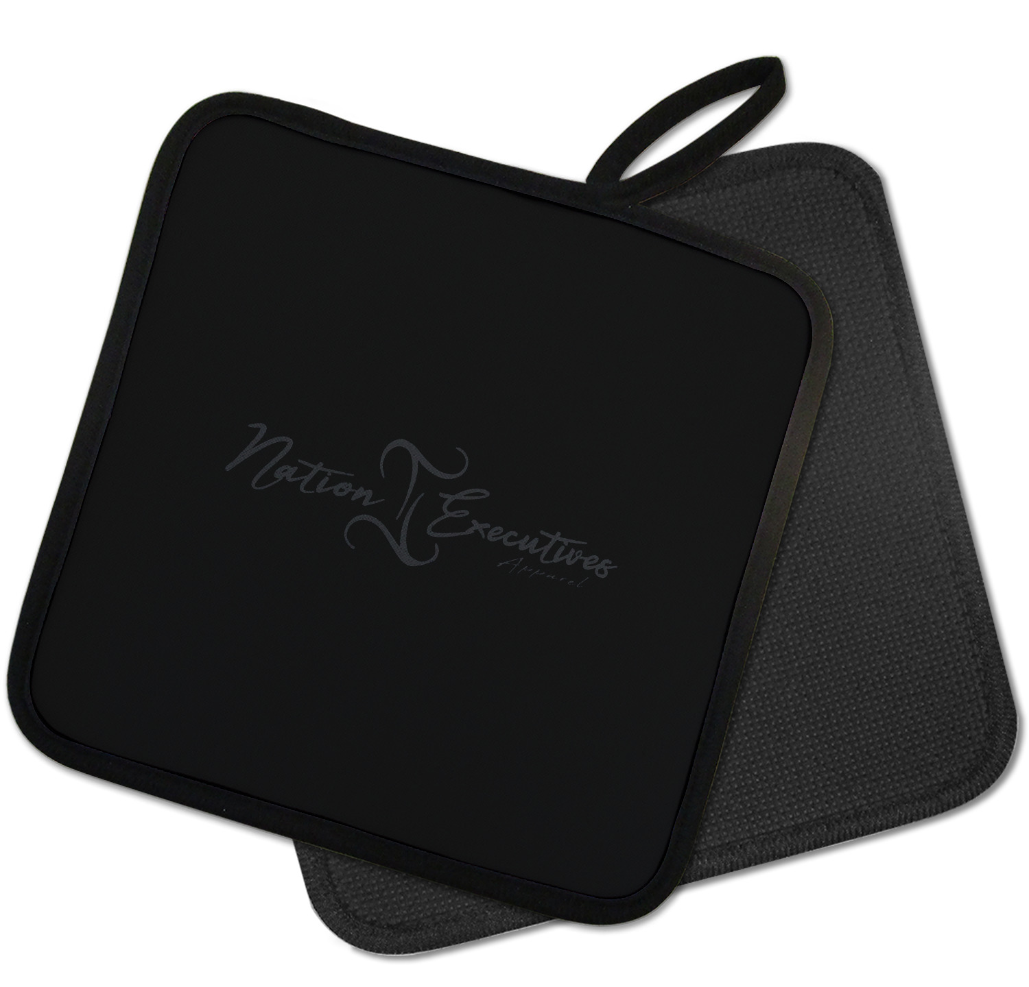 Our personalized pot holders feature a neoprene front that displays your personalization in vibrant colors. The backing of the hot pot holder is rubberized; the textured backing allows you to have a great grip when using this custom pot holder. The two materials are joined with a sleek, black trim, and the holder also includes an attached loop for hanging and storage. The pot holder is approximately 8.75 inches by 8.75 inches and 0.25 inches tall, while the fabric loop is 2.5 inches long. You can purchase a kitchen pot holder by itself or as a set of 2. We also offer a set including one pot holder and one oven mitt.