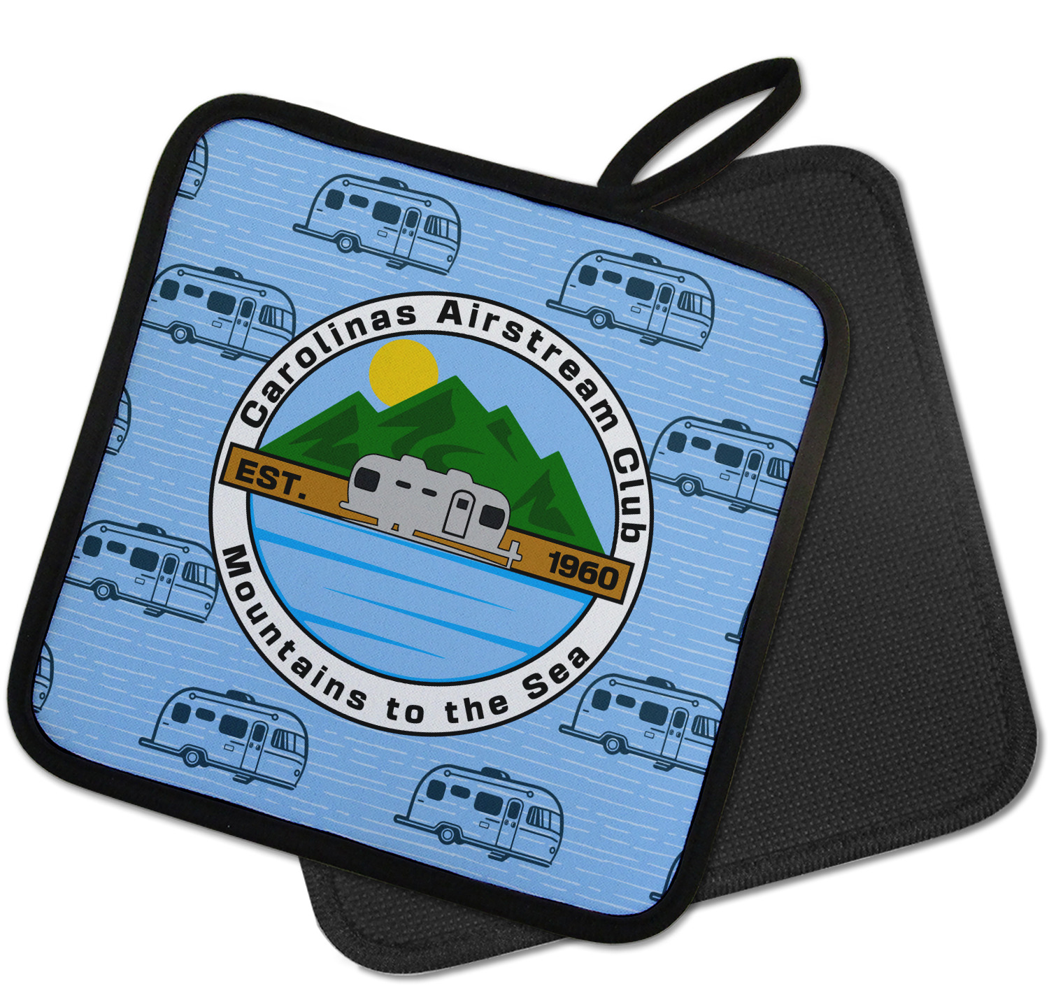 Our personalized pot holders feature a neoprene front that displays your personalization in vibrant colors. The backing of the hot pot holder is rubberized; the textured backing allows you to have a great grip when using this custom pot holder. The two materials are joined with a sleek, black trim, and the holder also includes an attached loop for hanging and storage. The pot holder is approximately 8.75 inches by 8.75 inches and 0.25 inches tall, while the fabric loop is 2.5 inches long. You can purchase a kitchen pot holder by itself or as a set of 2. We also offer a set including one pot holder and one oven mitt.