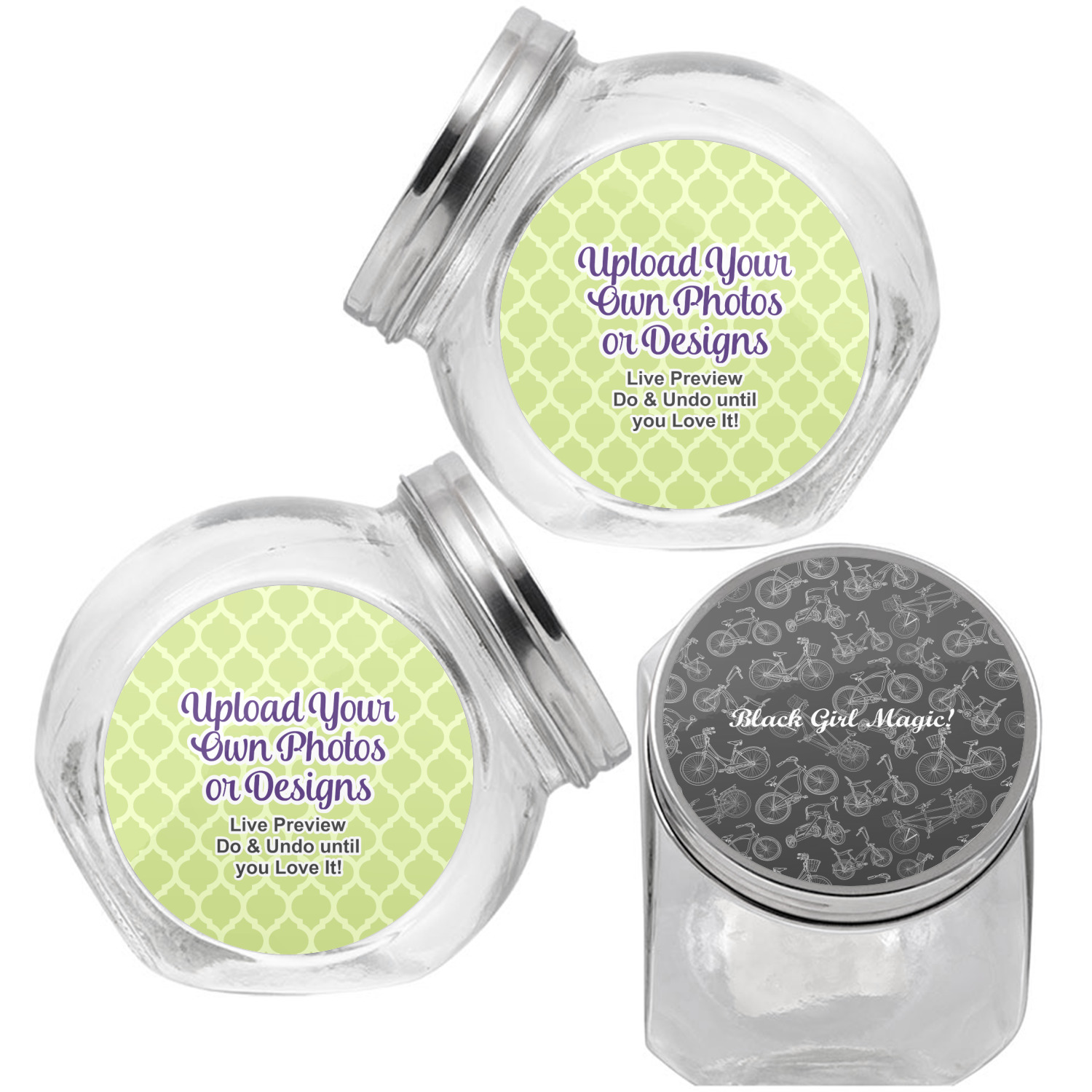 This treat jar is an excellent way to store treats for your favorite canine or feline. Moreover, their delicate, classy appearance makes them a tasteful addition to your countertop's décor. Crafted from clear glass, its unique construction and silver metal, screw-on lid allows for quick and easy access. Three, permanent, vinyl stickers are applied to both sides of the jar and lid, presenting your personalized design. The base of this glass, dog treat jar is 3.4" x 4.75", and the jar stands at 5" tall. Though on the smaller side, this jar is best suited for smaller treats or training treats.