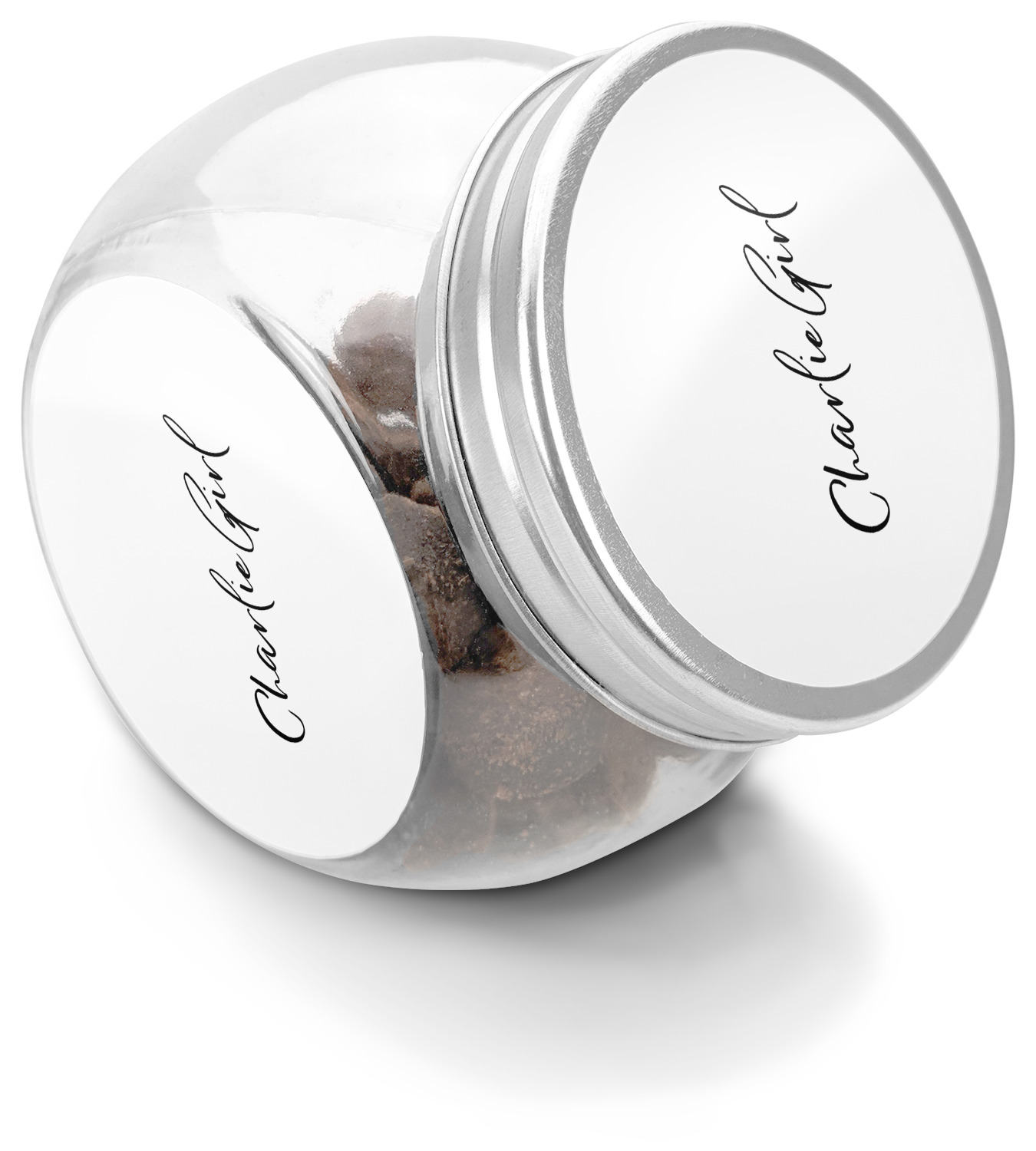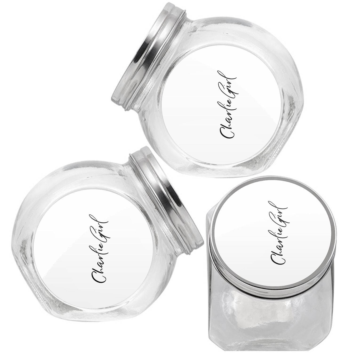 This treat jar is an excellent way to store treats for your favorite canine or feline. Moreover, their delicate, classy appearance makes them a tasteful addition to your countertop's décor. Crafted from clear glass, its unique construction and silver metal, screw-on lid allows for quick and easy access. Three, permanent, vinyl stickers are applied to both sides of the jar and lid, presenting your personalized design. The base of this glass, dog treat jar is 3.4" x 4.75", and the jar stands at 5" tall. Though on the smaller side, this jar is best suited for smaller treats or training treats.