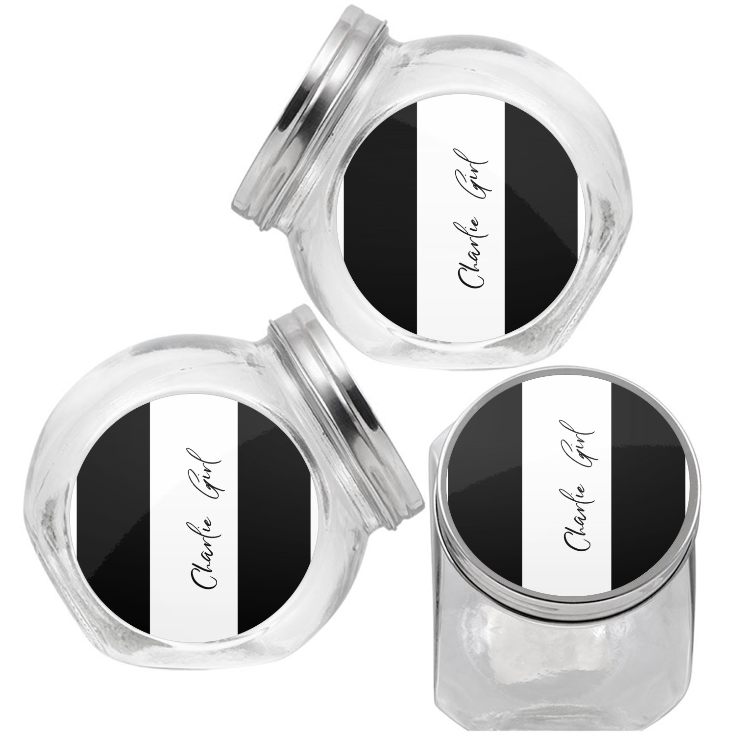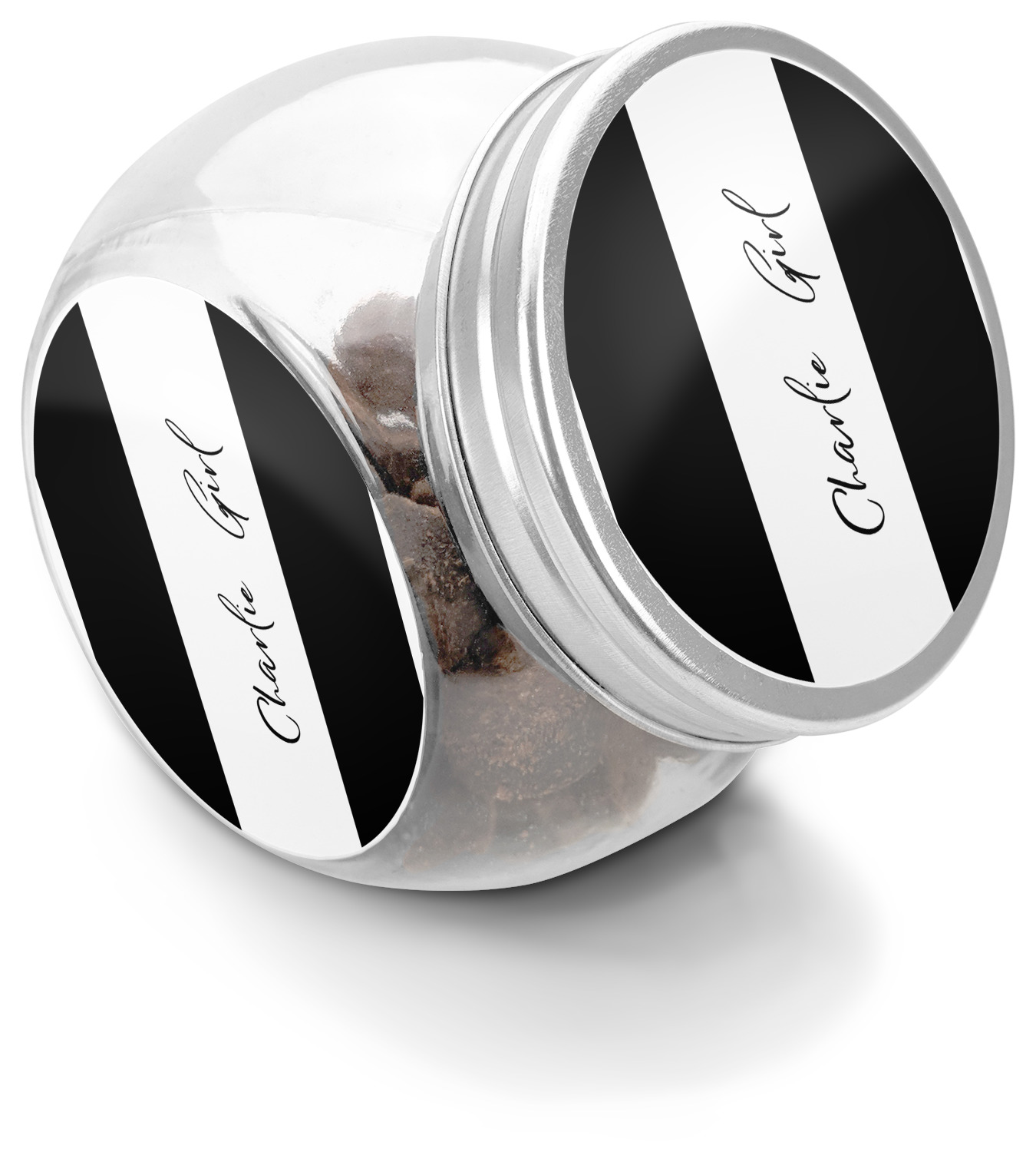 This treat jar is an excellent way to store treats for your favorite canine or feline. Moreover, their delicate, classy appearance makes them a tasteful addition to your countertop's décor. Crafted from clear glass, its unique construction and silver metal, screw-on lid allows for quick and easy access. Three, permanent, vinyl stickers are applied to both sides of the jar and lid, presenting your personalized design. The base of this glass, dog treat jar is 3.4" x 4.75", and the jar stands at 5" tall. Though on the smaller side, this jar is best suited for smaller treats or training treats.