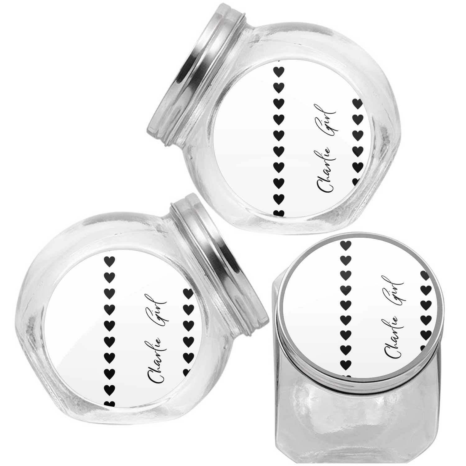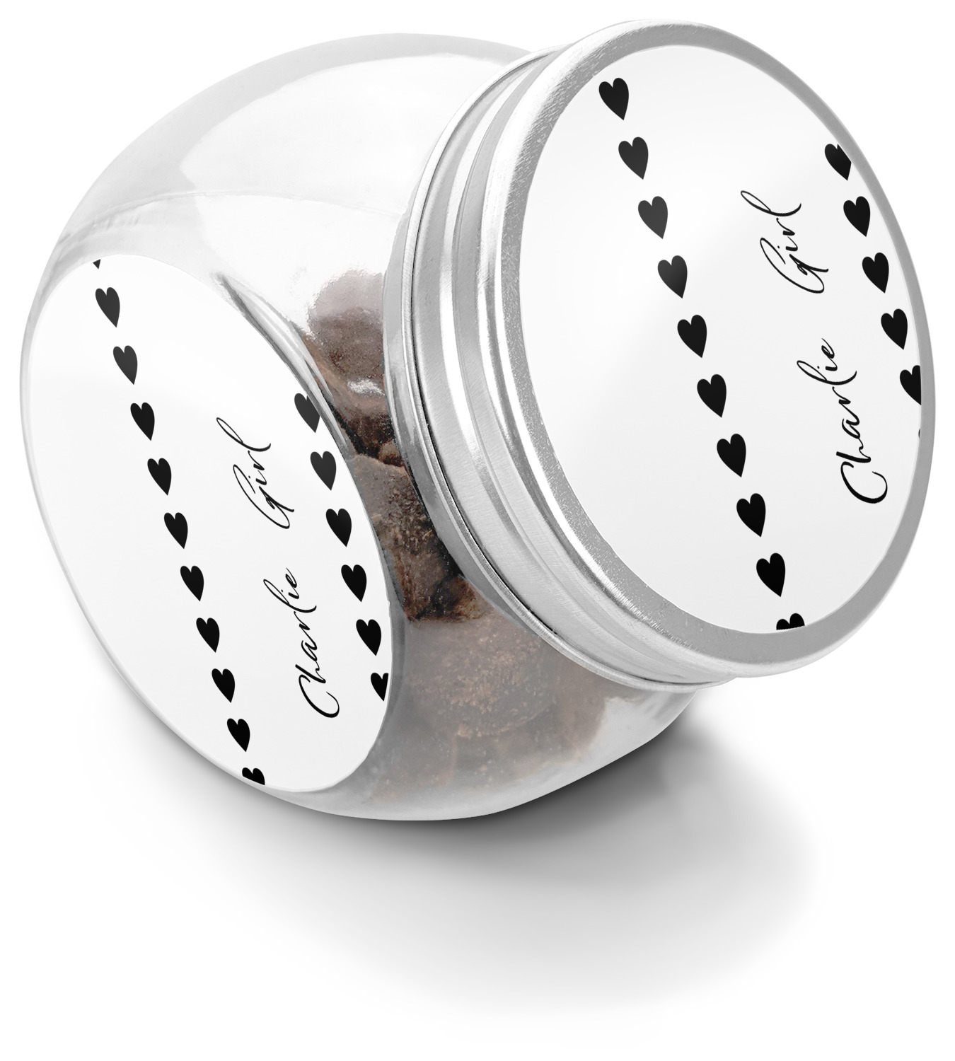 This treat jar is an excellent way to store treats for your favorite canine or feline. Moreover, their delicate, classy appearance makes them a tasteful addition to your countertop's décor. Crafted from clear glass, its unique construction and silver metal, screw-on lid allows for quick and easy access. Three, permanent, vinyl stickers are applied to both sides of the jar and lid, presenting your personalized design. The base of this glass, dog treat jar is 3.4" x 4.75", and the jar stands at 5" tall. Though on the smaller side, this jar is best suited for smaller treats or training treats.
