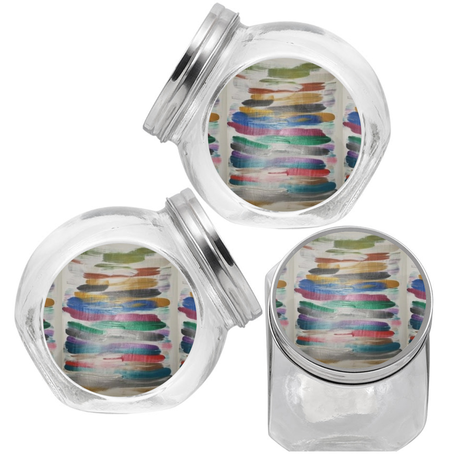 This treat jar is an excellent way to store treats for your favorite canine or feline. Moreover, their delicate, classy appearance makes them a tasteful addition to your countertop's décor. Crafted from clear glass, its unique construction and silver metal, screw-on lid allows for quick and easy access. Three, permanent, vinyl stickers are applied to both sides of the jar and lid, presenting your personalized design. The base of this glass, dog treat jar is 3.4" x 4.75", and the jar stands at 5" tall. Though on the smaller side, this jar is best suited for smaller treats or training treats.