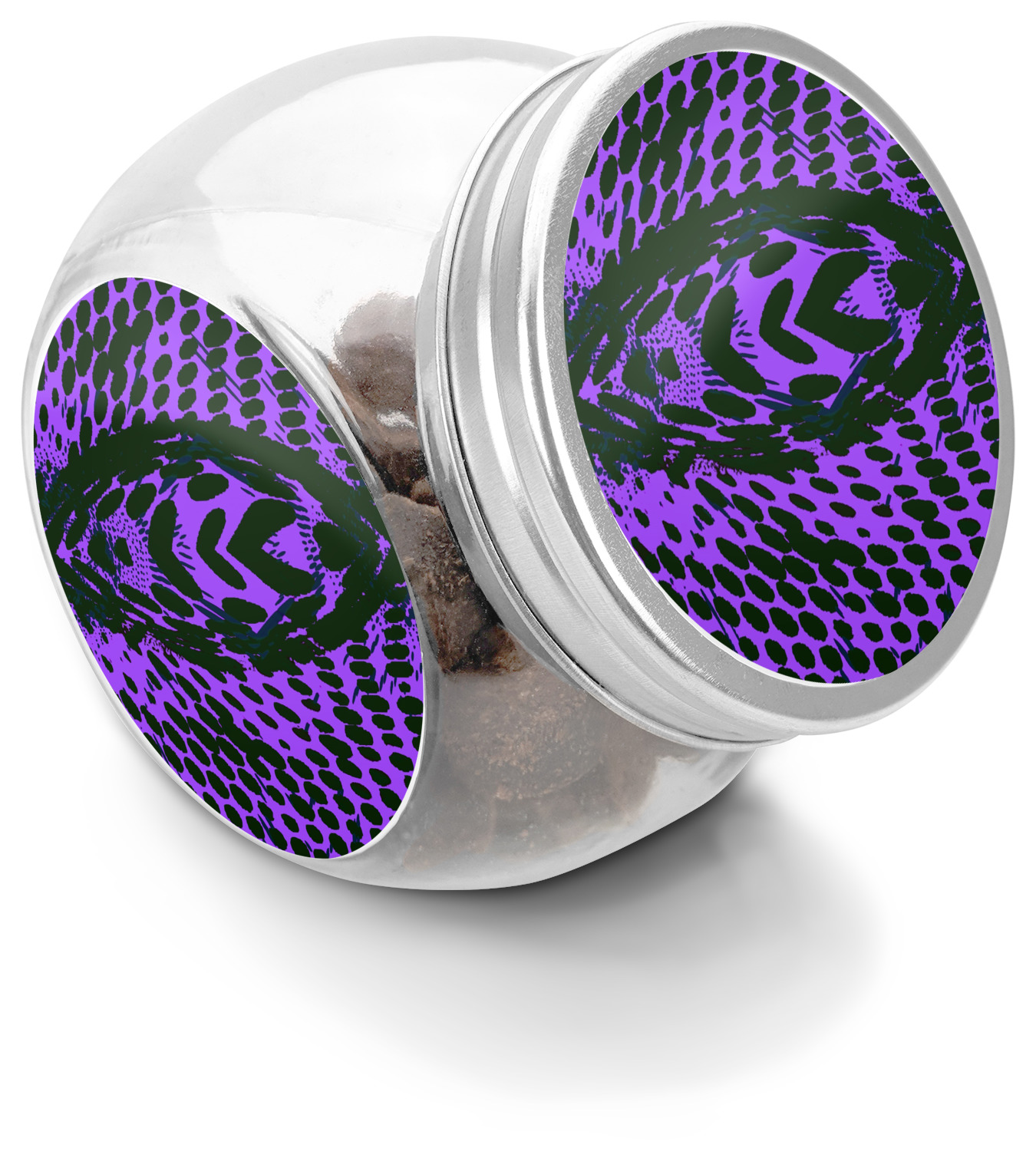 This treat jar is an excellent way to store treats for your favorite canine or feline. Moreover, their delicate, classy appearance makes them a tasteful addition to your countertop's décor. Crafted from clear glass, its unique construction and silver metal, screw-on lid allows for quick and easy access. Three, permanent, vinyl stickers are applied to both sides of the jar and lid, presenting your personalized design. The base of this glass, dog treat jar is 3.4" x 4.75", and the jar stands at 5" tall. Though on the smaller side, this jar is best suited for smaller treats or training treats.