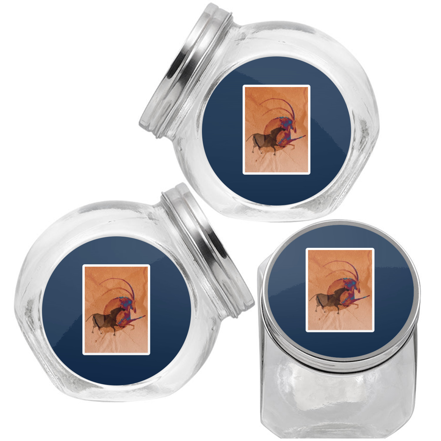 This treat jar is an excellent way to store treats for your favorite canine or feline. Moreover, their delicate, classy appearance makes them a tasteful addition to your countertop's décor. Crafted from clear glass, its unique construction and silver metal, screw-on lid allows for quick and easy access. Three, permanent, vinyl stickers are applied to both sides of the jar and lid, presenting your personalized design. The base of this glass, dog treat jar is 3.4" x 4.75", and the jar stands at 5" tall. Though on the smaller side, this jar is best suited for smaller treats or training treats.