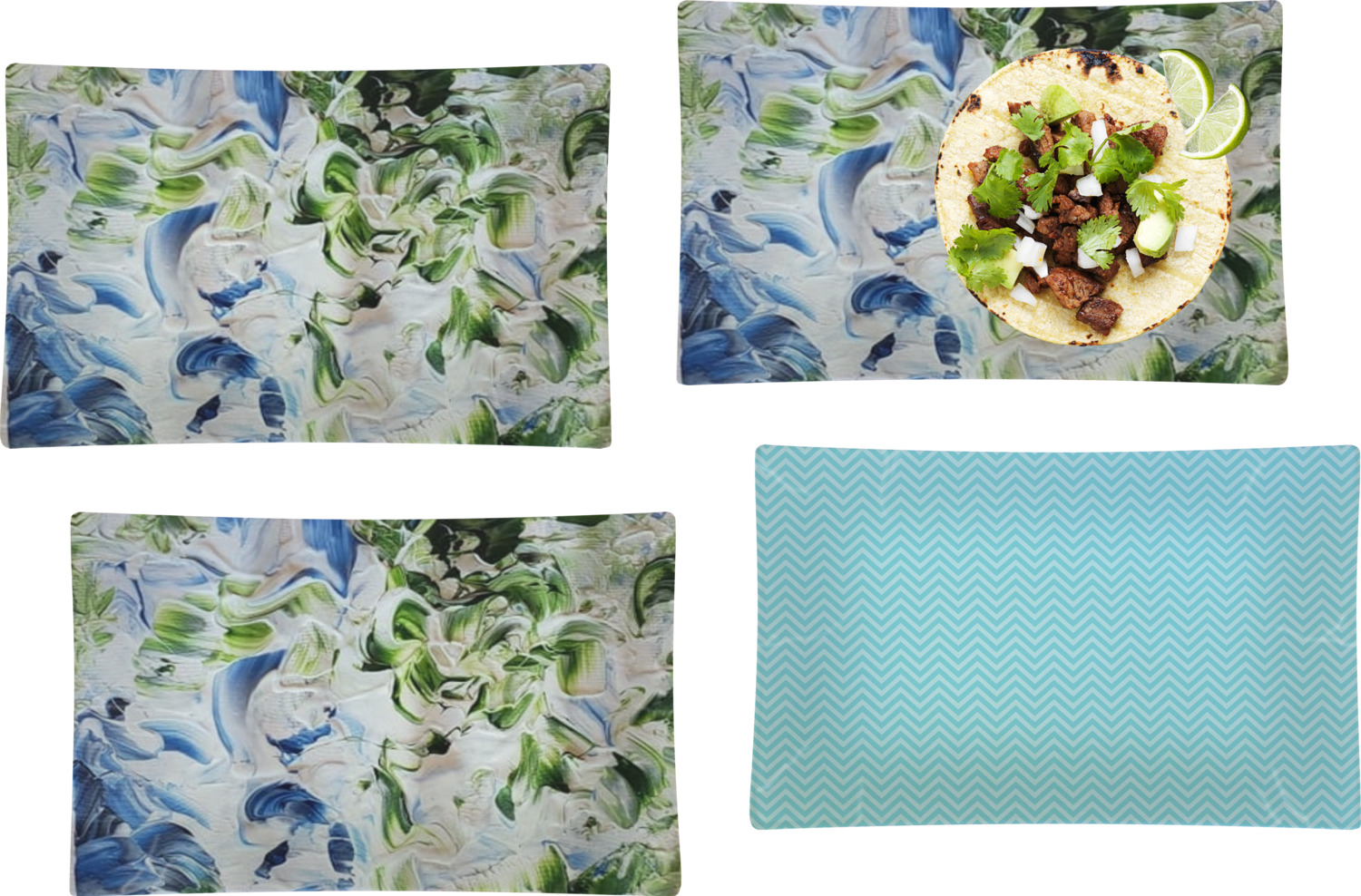 This rectangular plate is about 14" in width and 10" in height; the perfect size for lunch or dinner. These plates are dishwasher safe - proving high in function and in beauty.