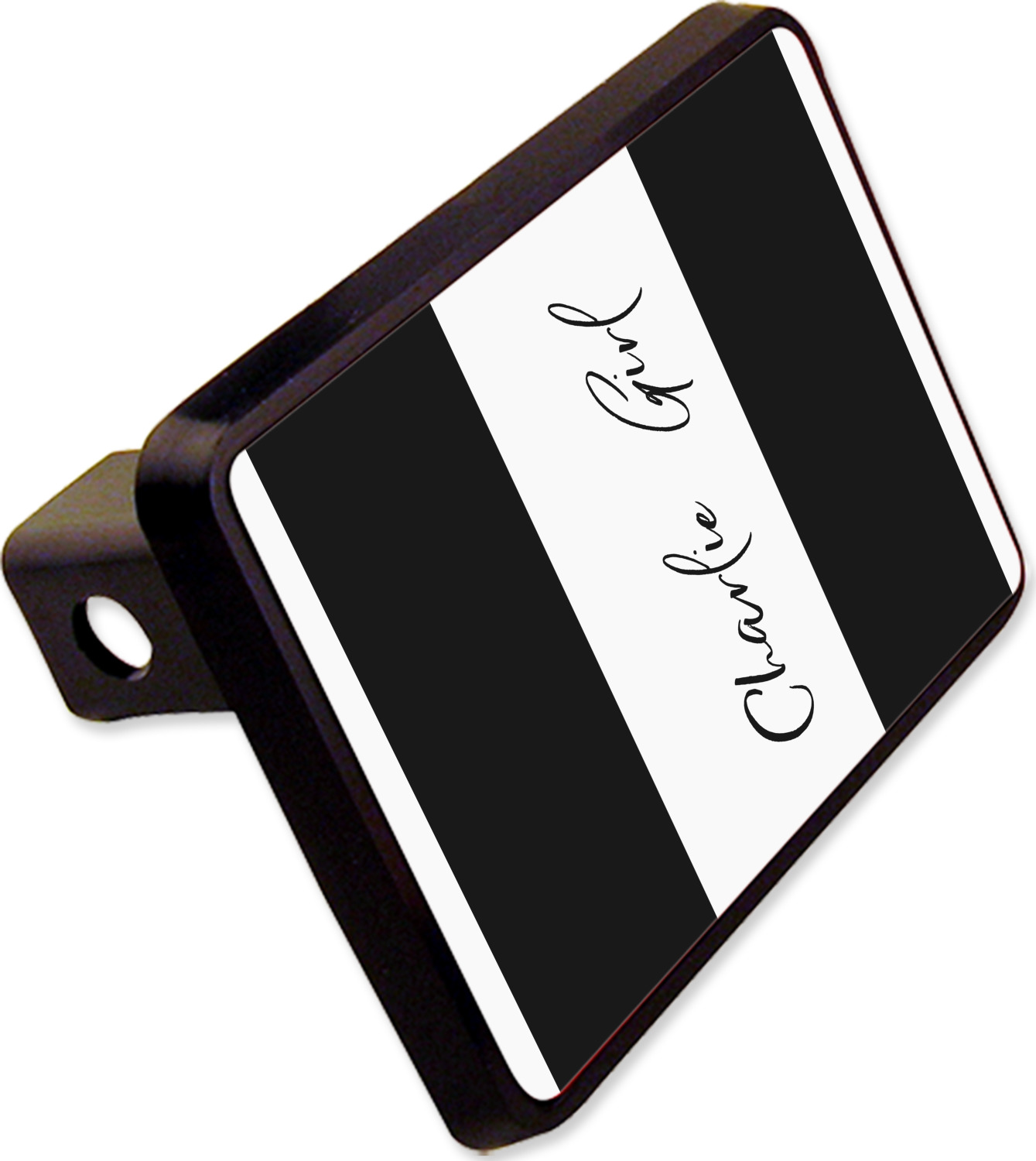 Our receiver hitch covers are molded, durable, and available in a size that fits 2in., square receiver holes. This model is best suited for a Class 3 or Class 4 hitch, but please consult our hitch sizing guide to make an informed purchase. We print your design on the surface of the rectangular cover, while the rest of the cover is a sleek, black color. The design's vibrancy will last up to 2 years in harsh sunlight. Designed for easy attachment, the cover slides easily into your trailer hitch and can be secured using a pin (not included).