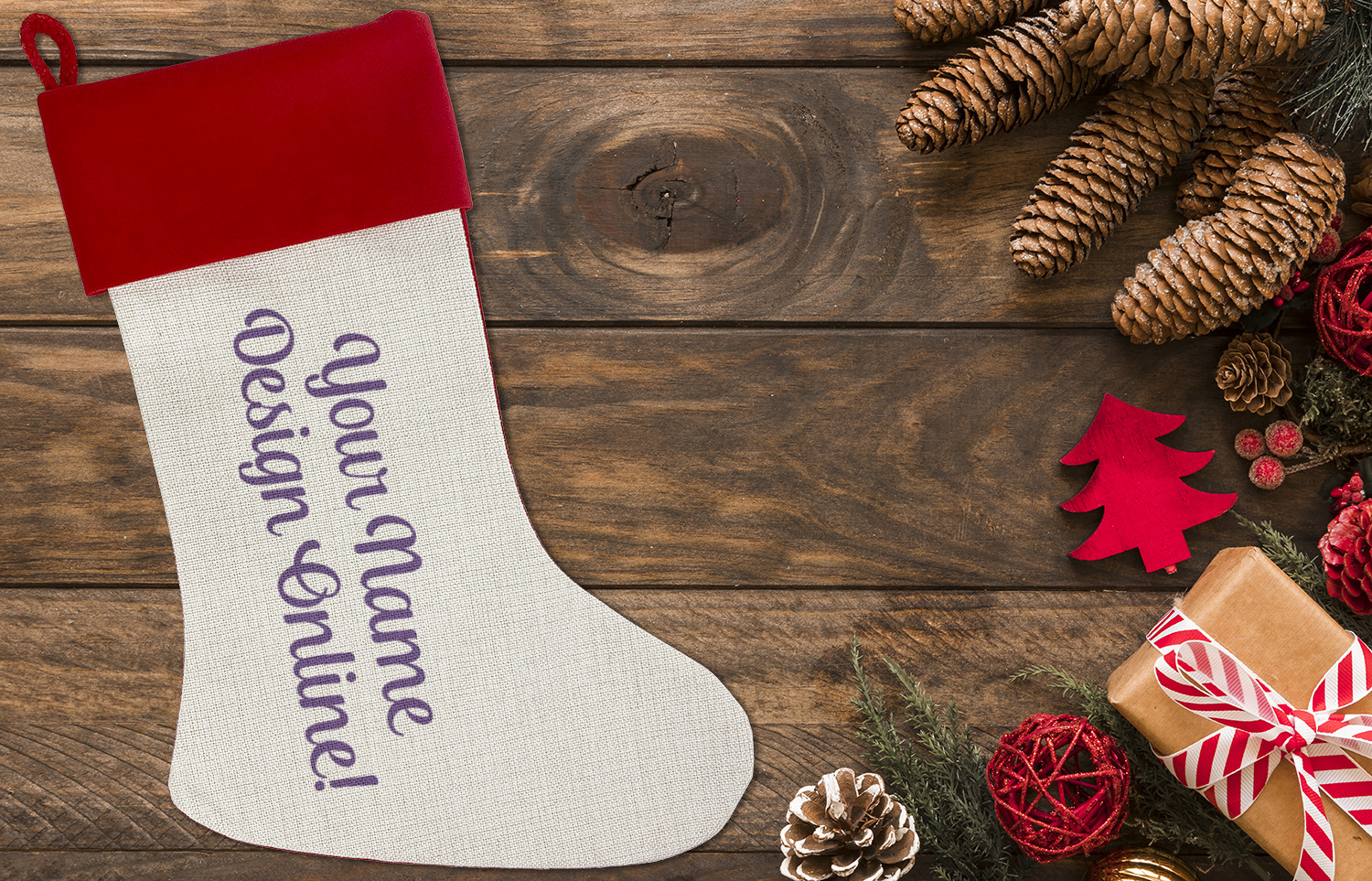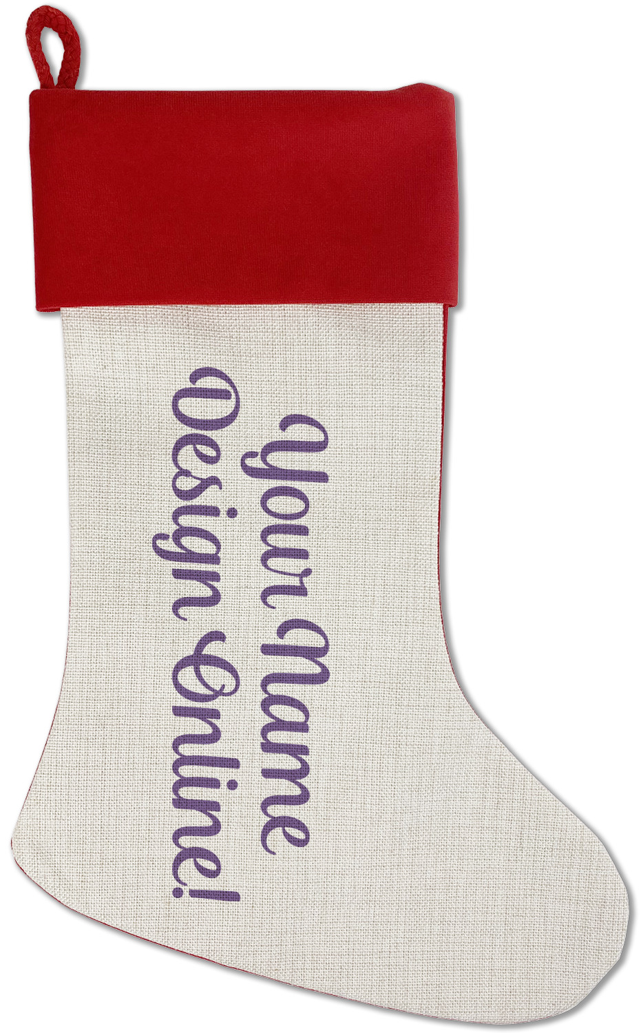 Our classic red stockings are made from a soft, yet durable polyester material perfect for any stocking stuffer! The front of our Christmas stockings have a linen front that boldly displays your custom design accented with a lush red cuff resting all around the stocking. Each stocking is approximately 18x12 with a durable cotton rope loop for hanging.