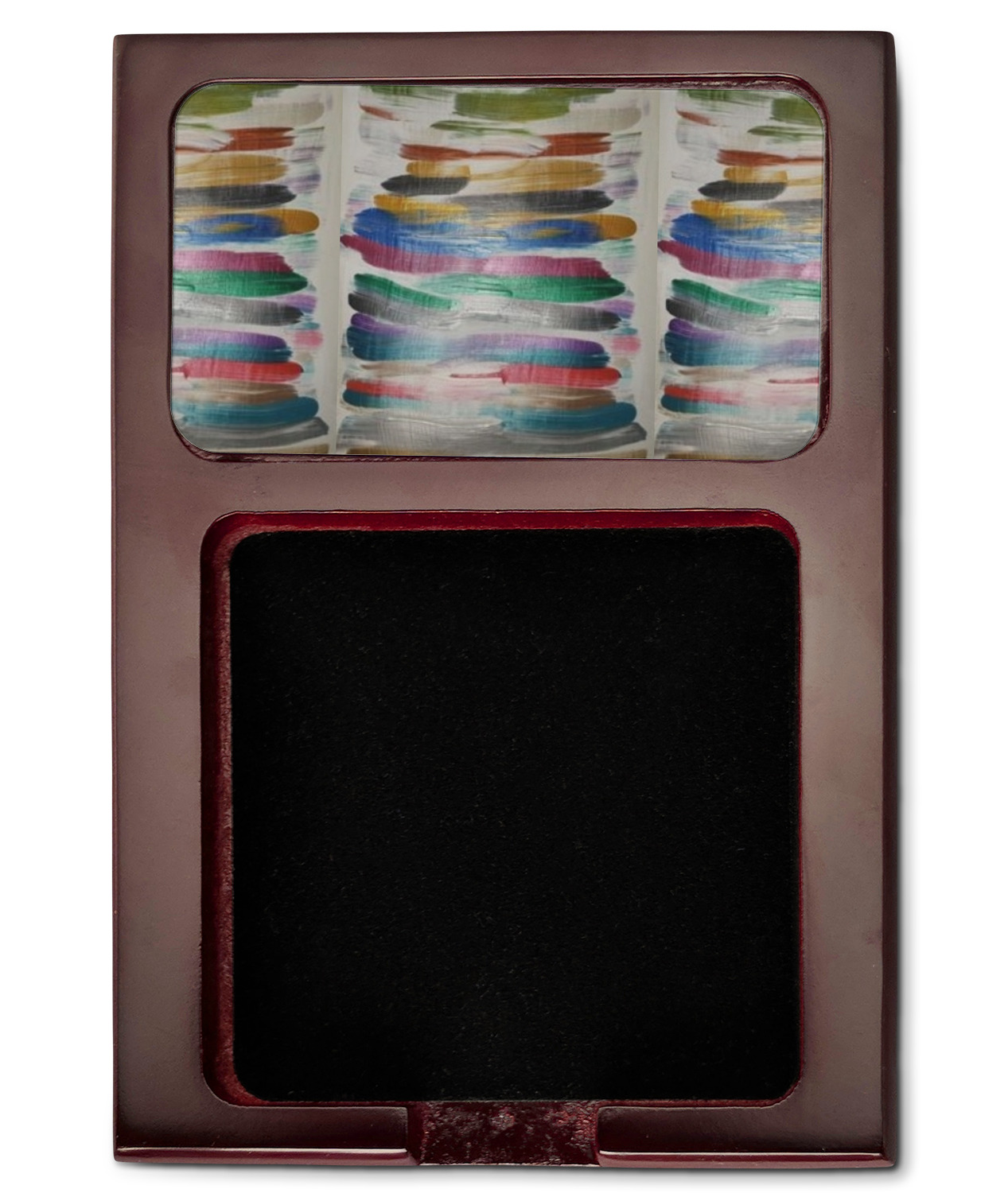 Crafted from a fine mahogany, this post it note holder is in the shade of a dark, cherry color. The dispenser itself is about 4.25 by 6.25 by 0.75 inches. You can place your 3 by 3 inch sticky notes in the indentation below the nameplate. We print your customization onto the nameplate that rests above the velvety indentation.