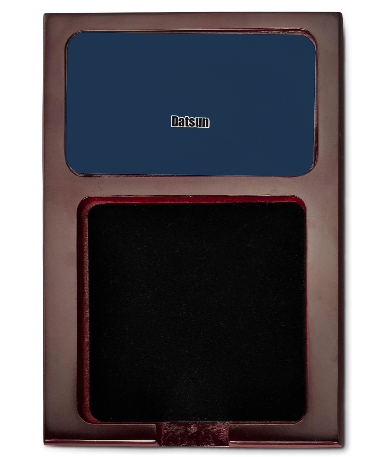 Crafted from a fine mahogany, this post it note holder is in the shade of a dark, cherry color. The dispenser itself is about 4.25 by 6.25 by 0.75 inches. You can place your 3 by 3 inch sticky notes in the indentation below the nameplate. We print your customization onto the nameplate that rests above the velvety indentation.