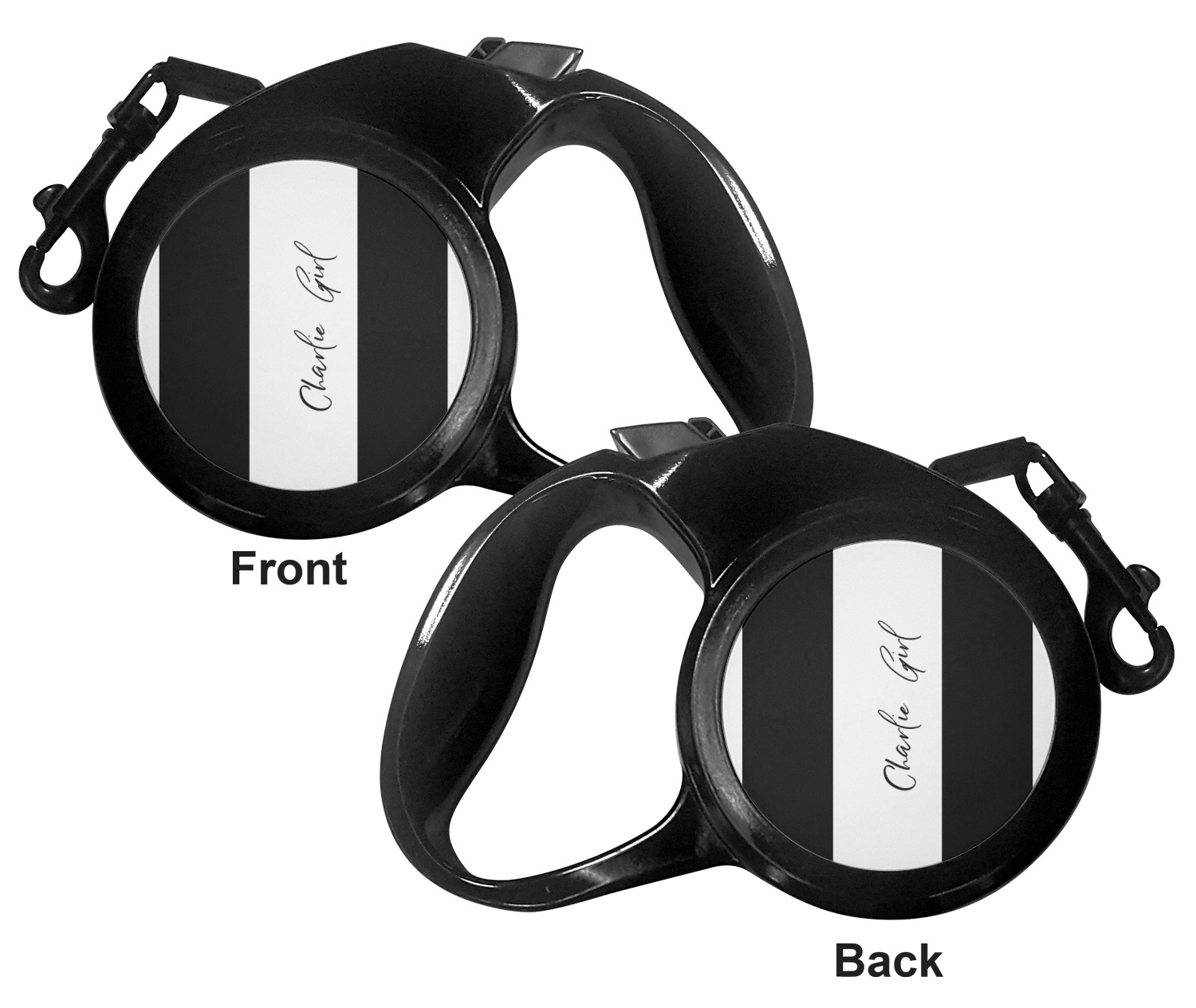 The leash's plastic handle is accommodating of your grip and displays your customization on both sides. The dog leash also features the traditional bolt snap clip, for easy fastening to your dog's collar. The leash and leash handle themselves are both black in color.
