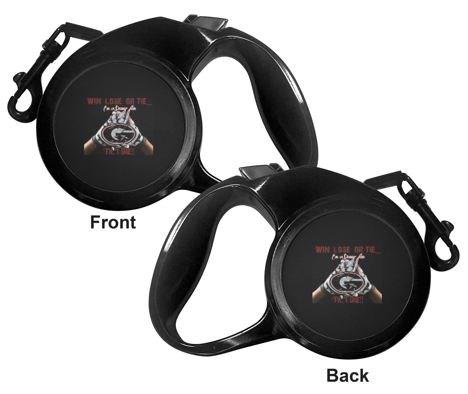 The leash's plastic handle is accommodating of your grip and displays your customization on both sides. The dog leash also features the traditional bolt snap clip, for easy fastening to your dog's collar. The leash and leash handle themselves are both black in color.