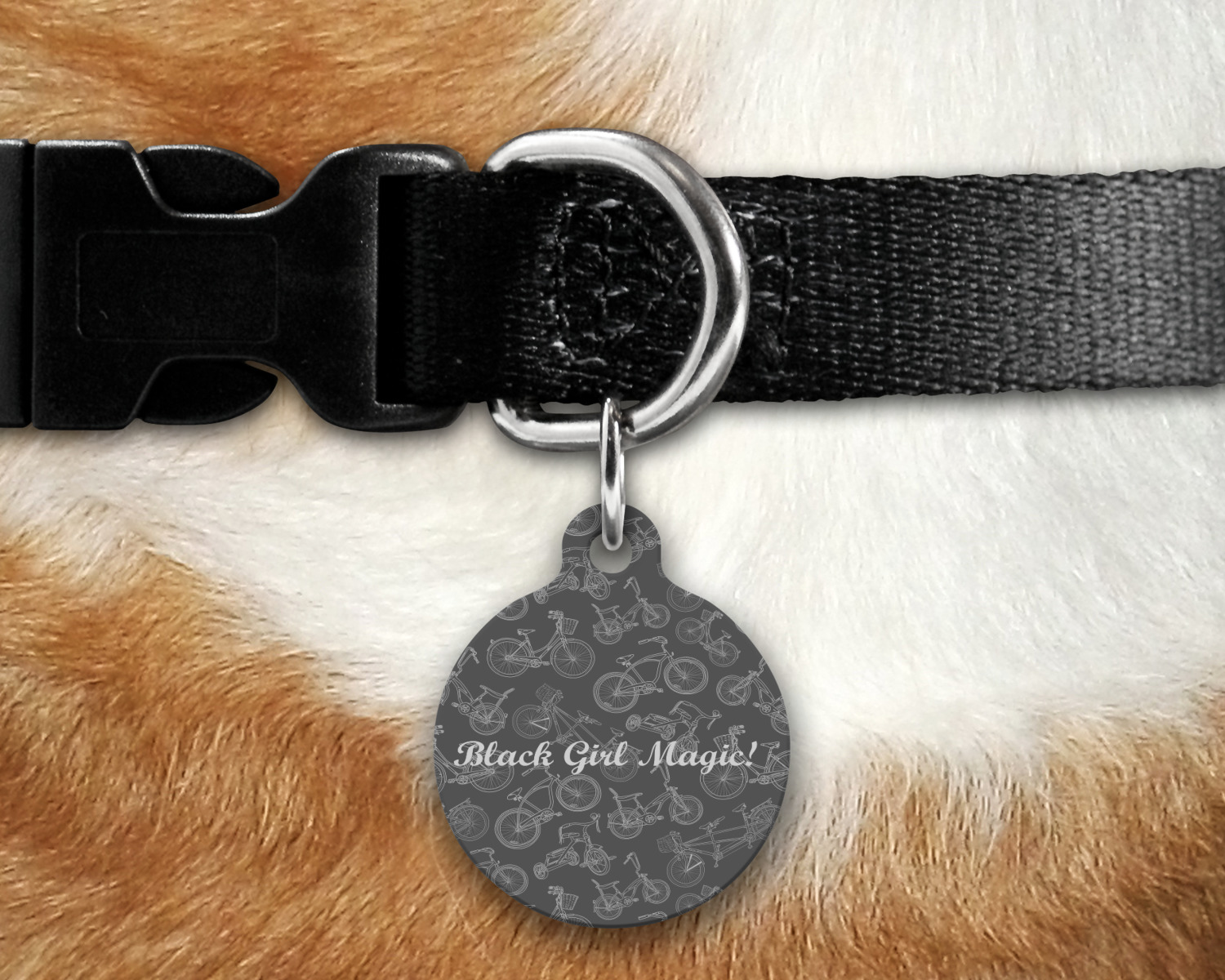 Go ahead; skip the monotony of plain pet ID tags with your very own, customized & personalized, round pet tag! This pet ID tag, fitting for both cats and dogs, will catch the eye of any onlooker (humans, canines, and felines, alike!) and accentuate your pet's individual personality.