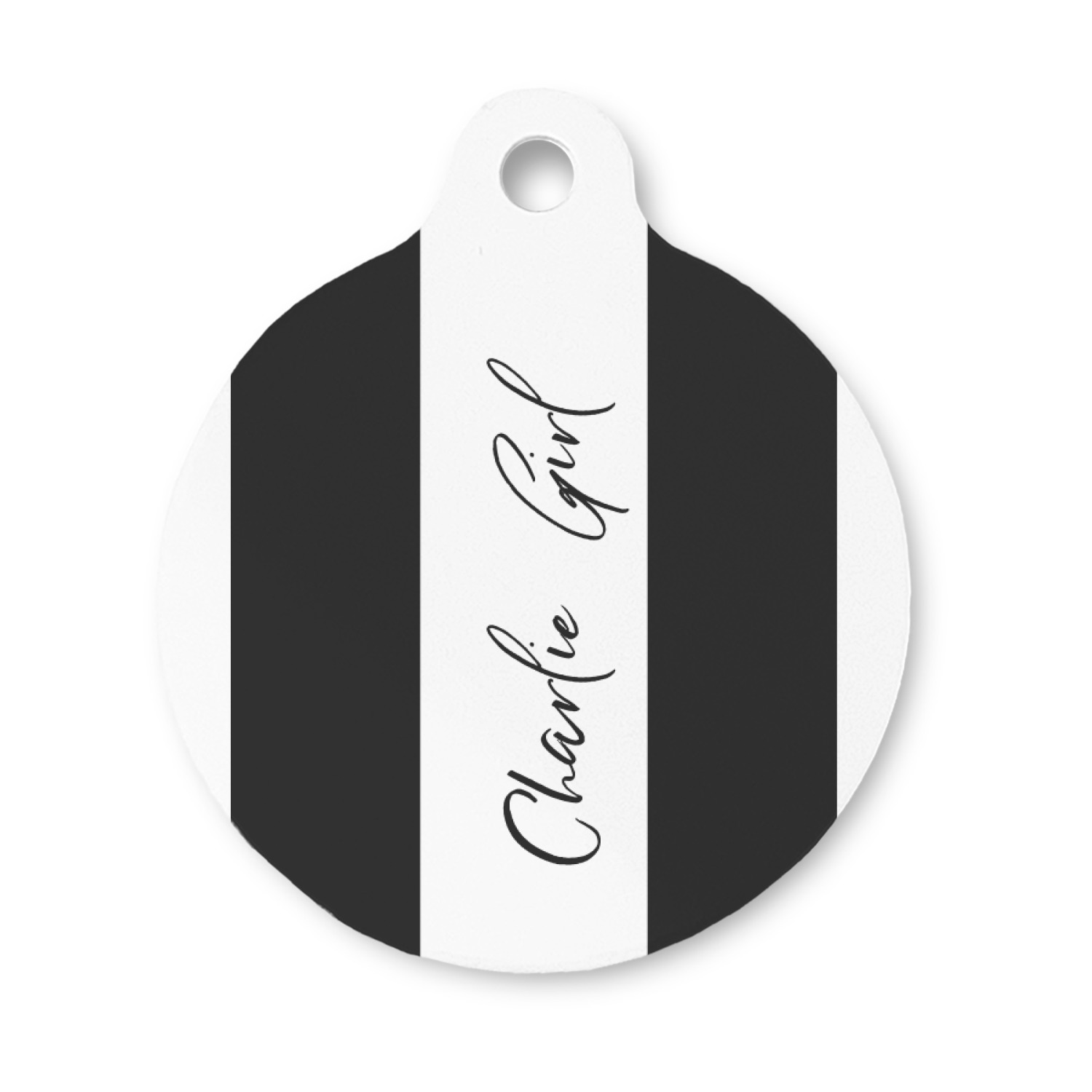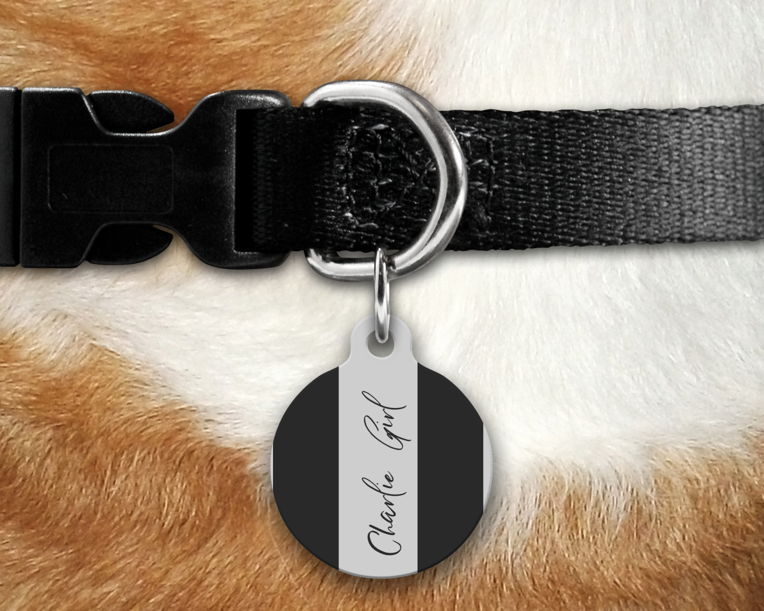 Go ahead; skip the monotony of plain pet ID tags with your very own, customized & personalized, round pet tag! This pet ID tag, fitting for both cats and dogs, will catch the eye of any onlooker (humans, canines, and felines, alike!) and accentuate your pet's individual personality.