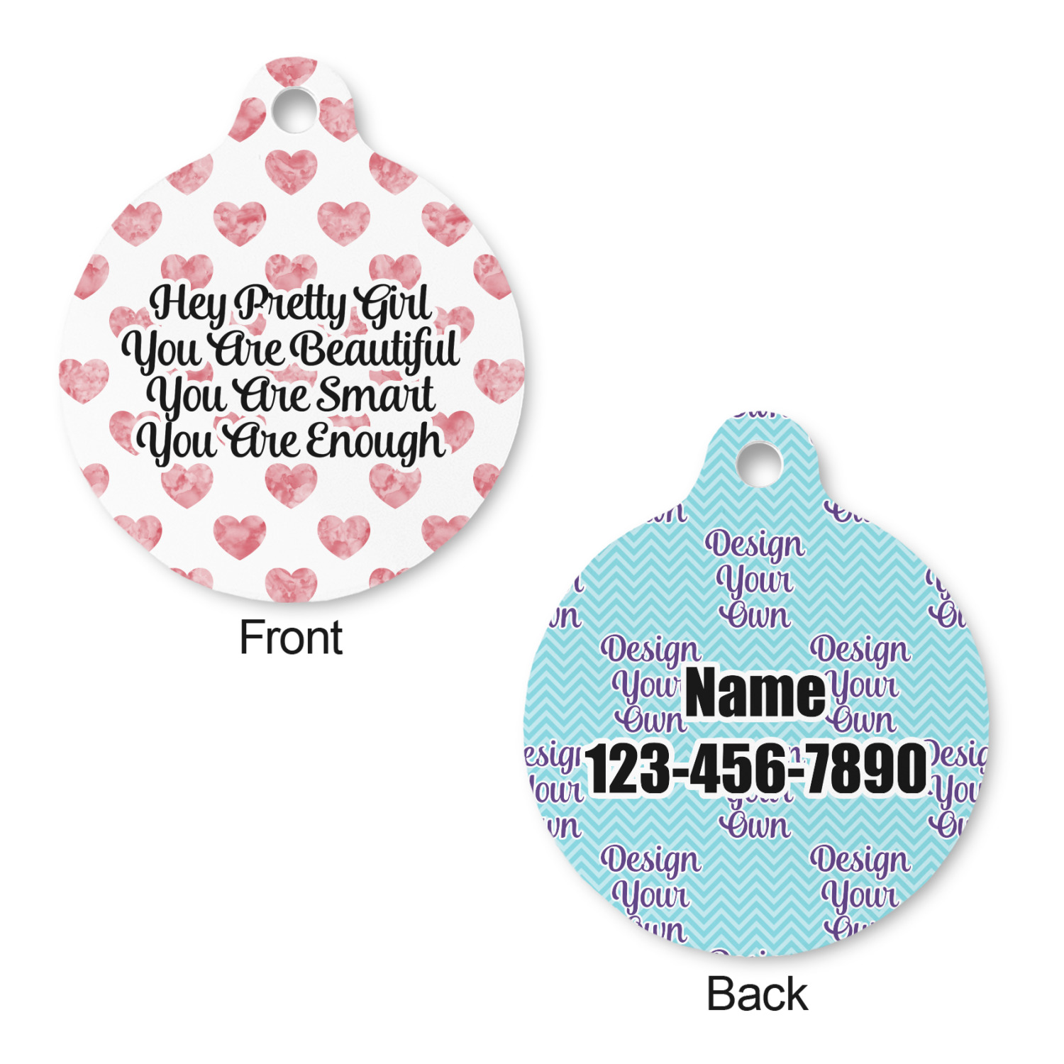 Go ahead; skip the monotony of plain pet ID tags with your very own, customized & personalized, round pet tag! This pet ID tag, fitting for both cats and dogs, will catch the eye of any onlooker (humans, canines, and felines, alike!) and accentuate your pet's individual personality.