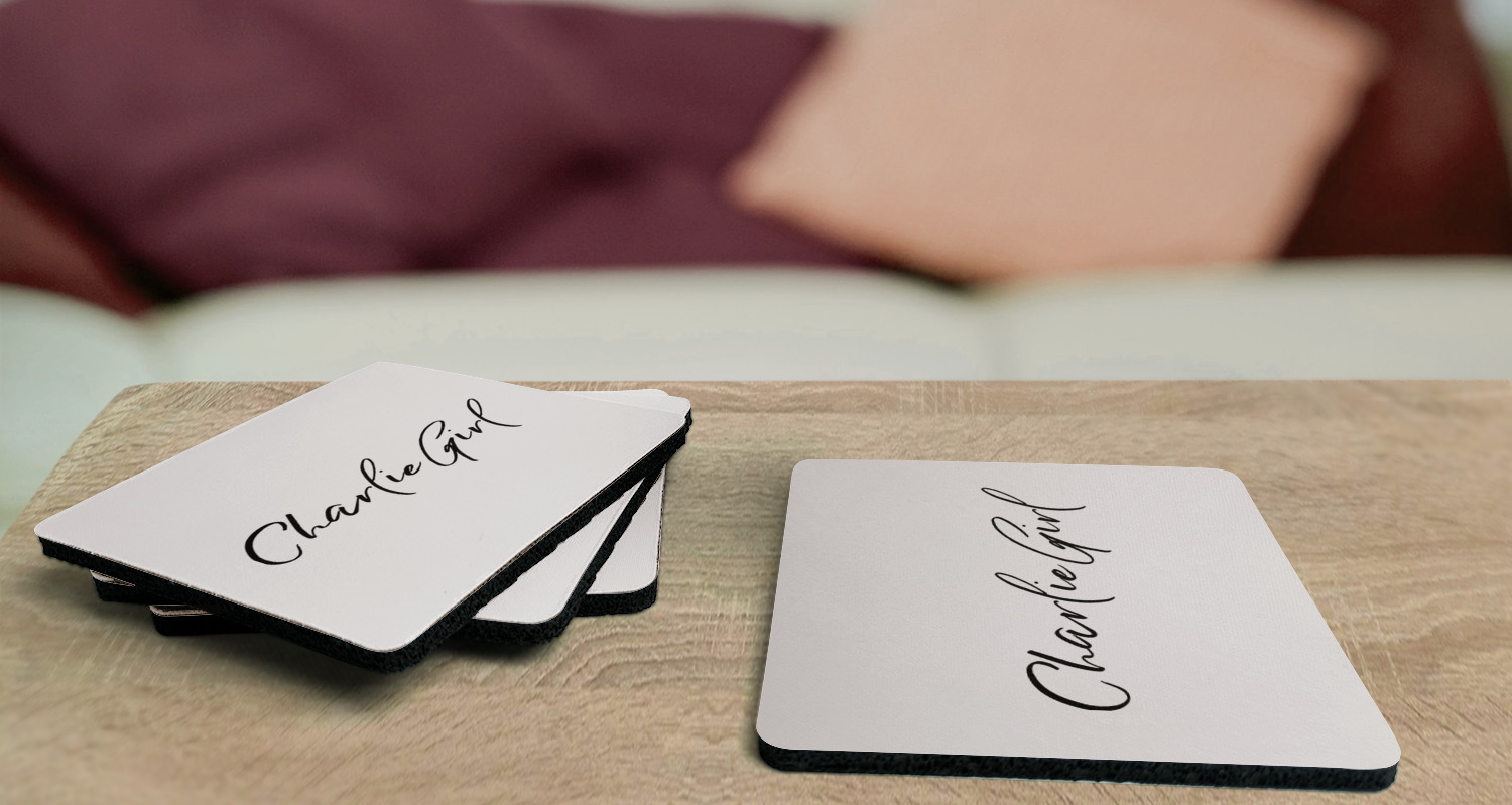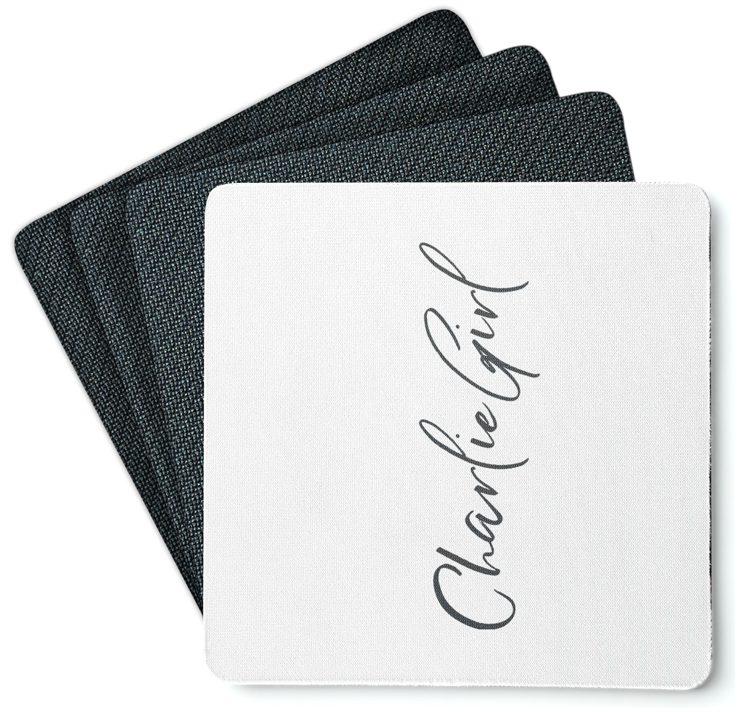 These drink coasters have a smooth, polyester top and a textured, rubber backing on its bottom. The non-slip rubber backing underneath works to keep any spills at bay. At 4 by 4 by 0.25 inches thick, these custom coasters are a suitable size for most drinkware. Your personalization is displayed atop the face of the cup coaster. We sell these rubber coasters in two different shapes: square and round. You can buy each shape as singulars or as a set of 4.