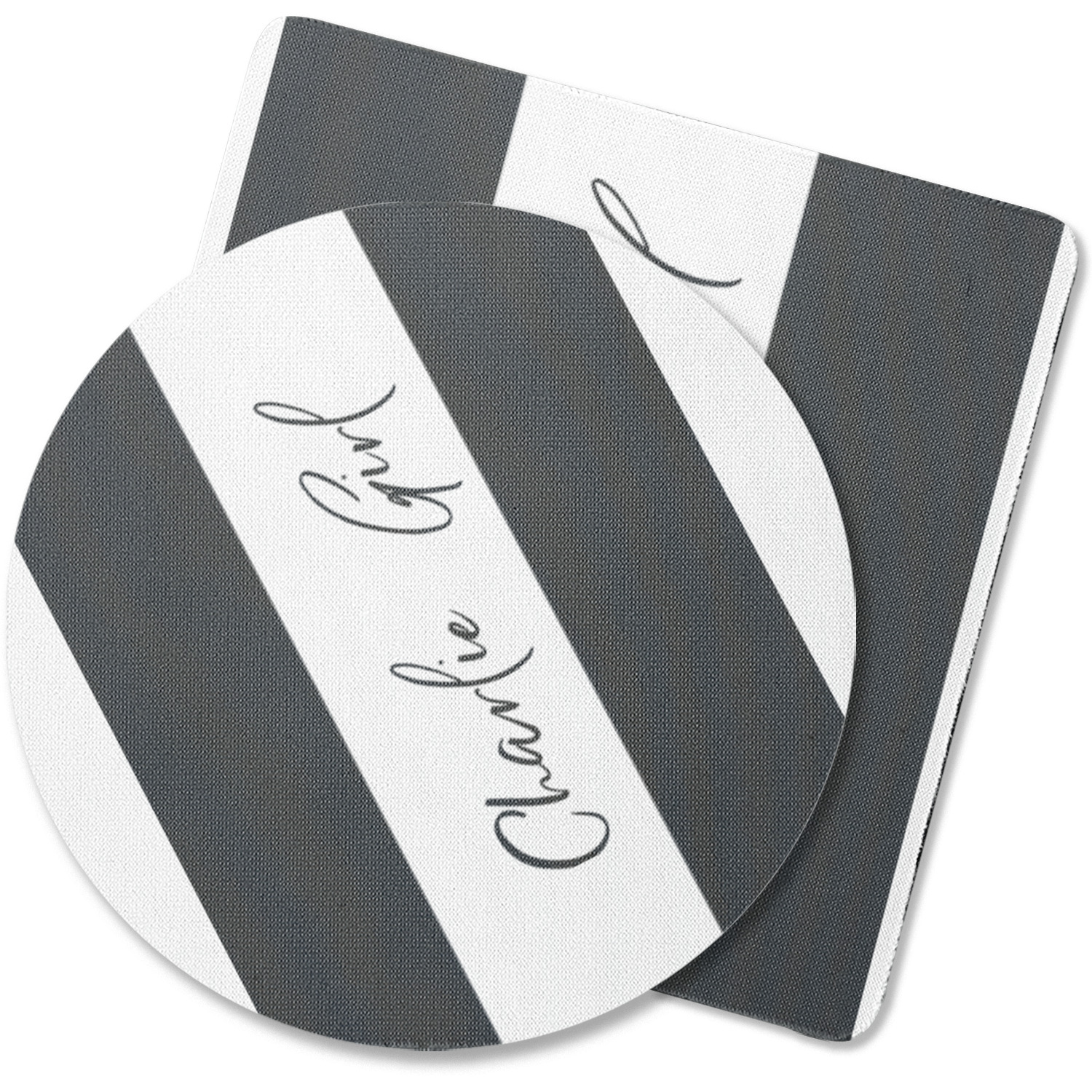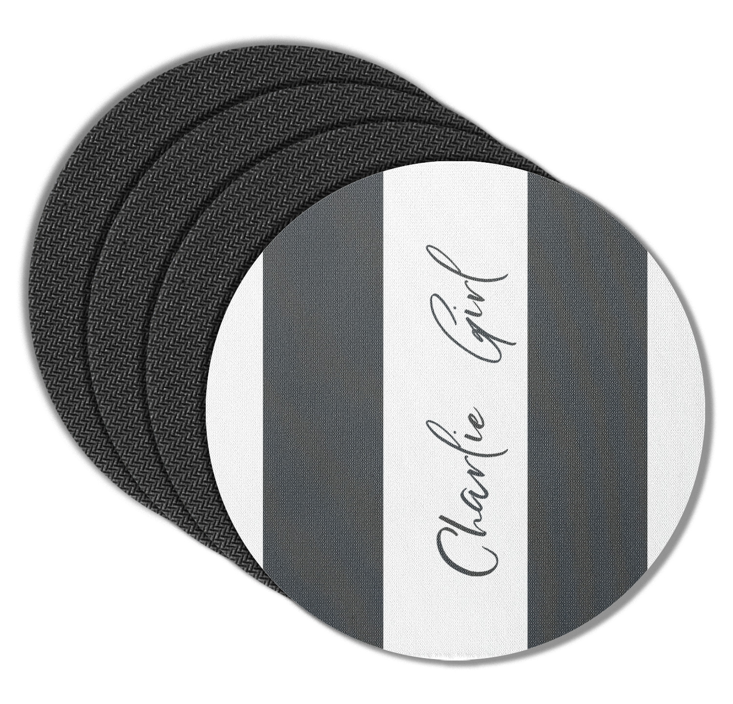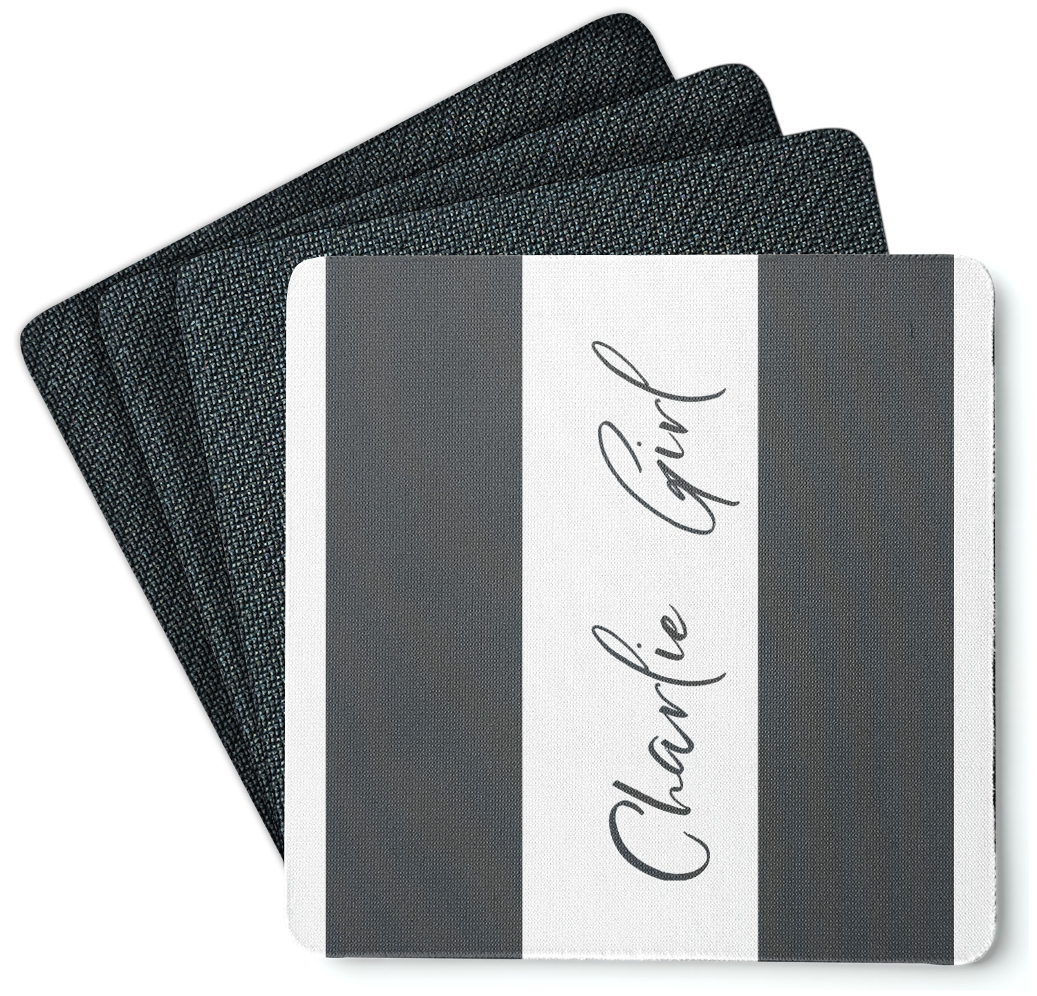 These drink coasters have a smooth, polyester top and a textured, rubber backing on its bottom. The non-slip rubber backing underneath works to keep any spills at bay. At 4 by 4 by 0.25 inches thick, these custom coasters are a suitable size for most drinkware. Your personalization is displayed atop the face of the cup coaster. We sell these rubber coasters in two different shapes: square and round. You can buy each shape as singulars or as a set of 4.