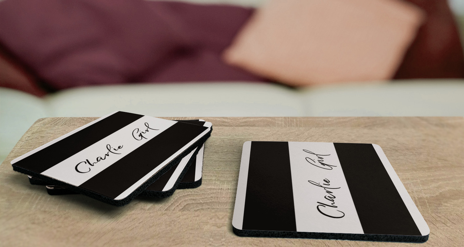Replace your boring, run-of-the-mill coasters with a set of 4 personalized coasters! When personalized, these coasters will protect your beloved surfaces while adding to your home's decor! Thanks to your coasters bright colors and unique design, your guests will be eager to use them!